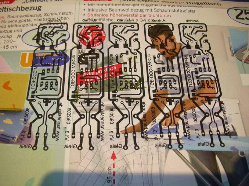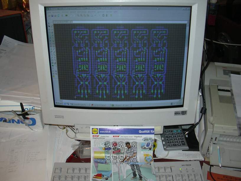 5 Platinen werden mit Eagle zu einem sogenannten Nutzen zusammengestellt (siehe Bildschirm) und mit Laserdrucker auf Werbepapier ausgedruckt (siehe unten auf der Tastatur).