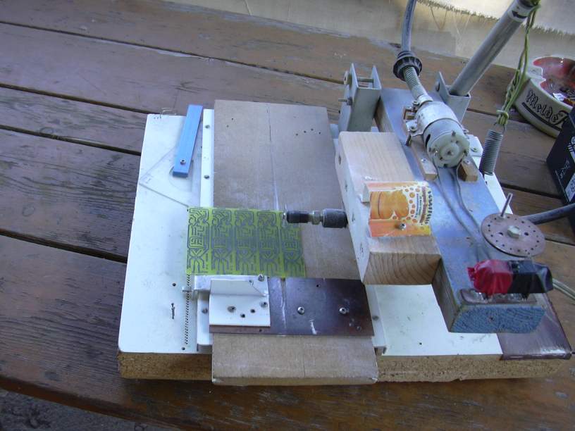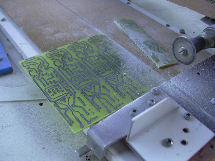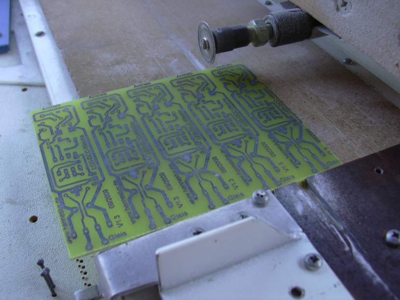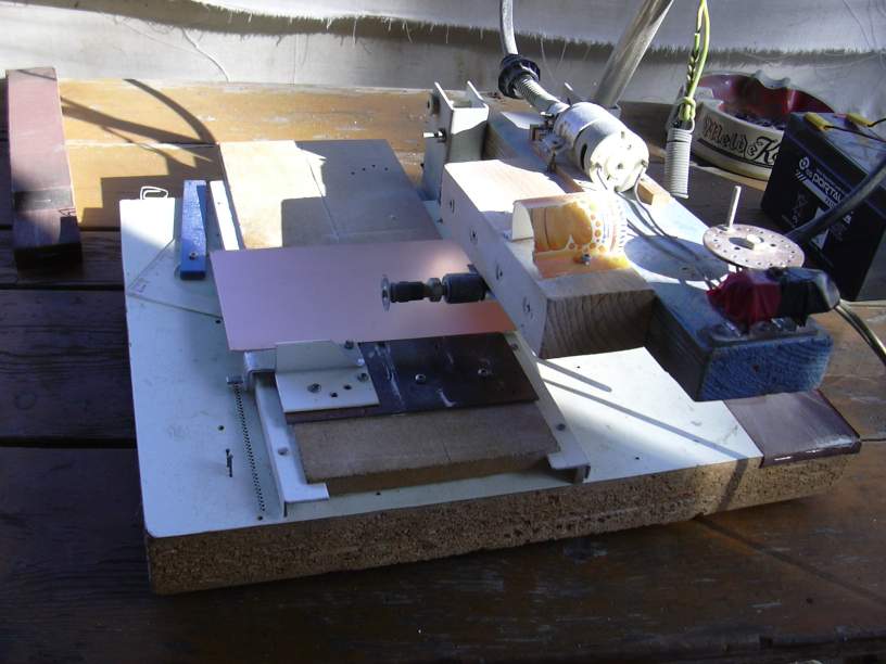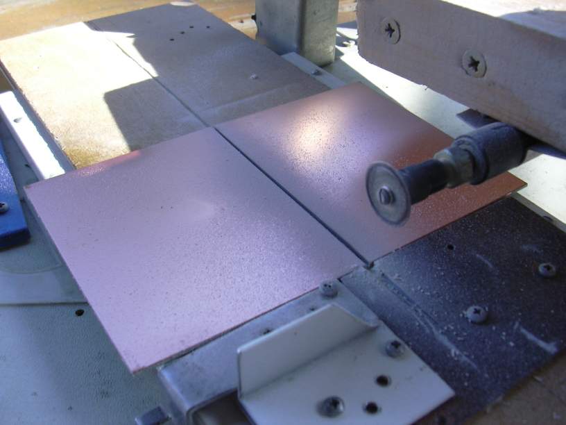 Eagle-Light ist auf die Größe von 100 x 80 mm limitiert, der Platinenrohling ist aber 100 x 160 mm groß. Er muss deshalb zuvor geteilt werden. Dies wird mit der Miniflex (mit Diamantscheibe 20 mm und Schiebetisch) erledigt.