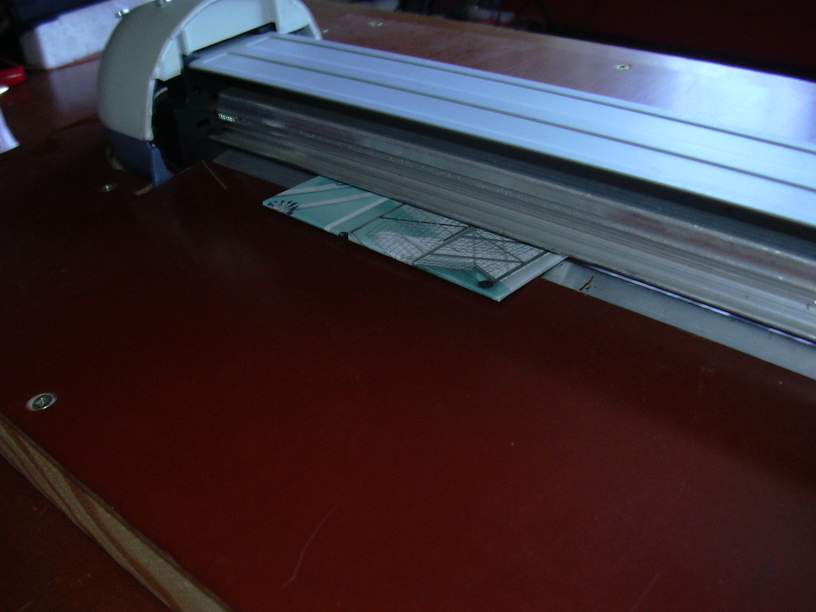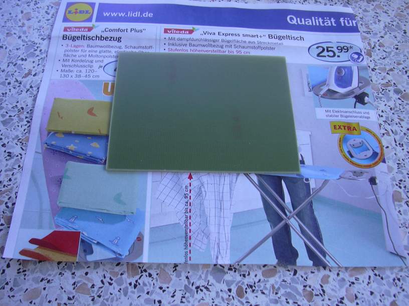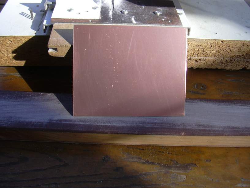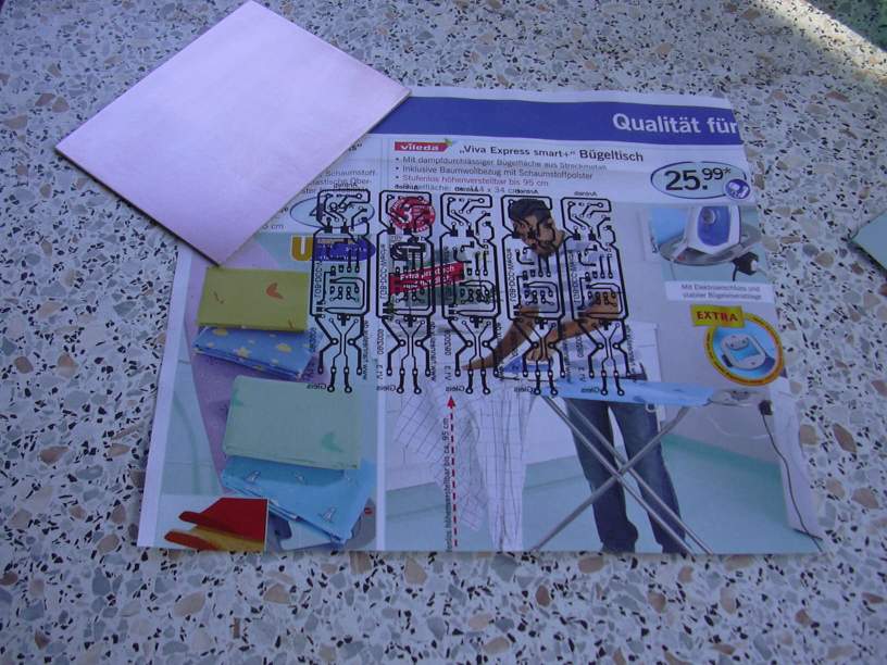 Die Platine ist nun zum Kontakt mit dem Laserausdruck bereit. Sie wird auf dem Papier ausgerichtet.