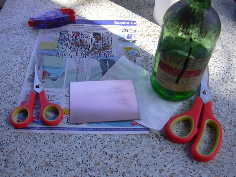 Damit der Laserausdruck während des mehrfachen Laminierens nicht verrutscht, muss das Papier auf der Platine fixiert werden. Die einfachste Möglichkeit ist das straffe Einpacken der Platine in das Papier.