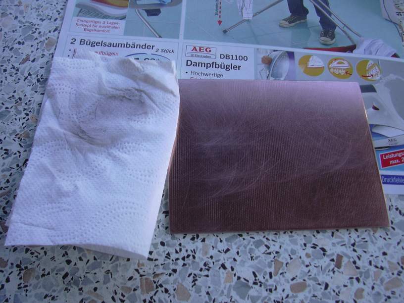 Die Papier-Rückstände werden nun vorsichtig mit den Fingern abgerubbelt. Der Toner bleibt dabei als Ätz-Resist auf dem Kupfer haften.