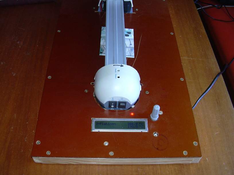 Die eingepackte Platine wird nun 10 bis 15 mal durch den auf 205°C aufgeheizten Laminator geschoben. Durch dessen Hitze schmilzt der Toner noch mal und klebt durch den Druck auf dem Kupfer fest. Die Temperatur ist ein Kompromiss. Ist es zu kalt, dann klebt der Toner nicht an. Ist es zu warm, dann klebt auch die Druckfarbe an und der Toner verläuft, was zu Brücken auf der Platine führen kann.