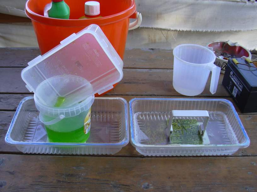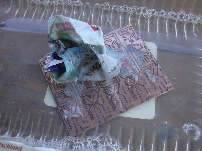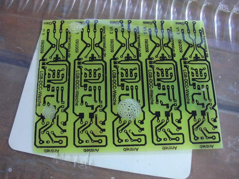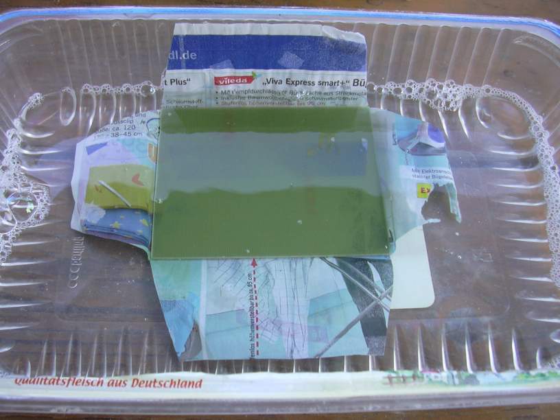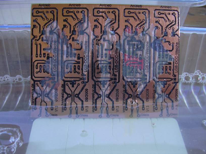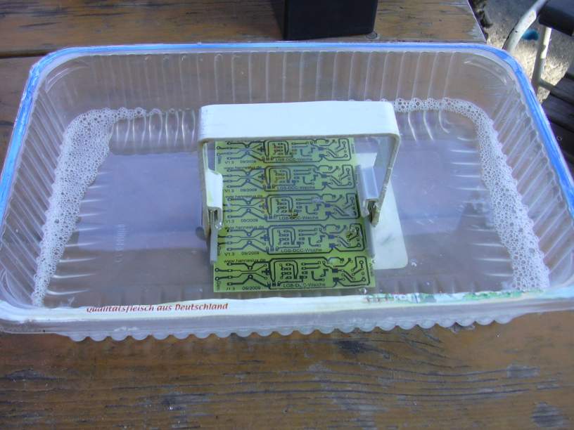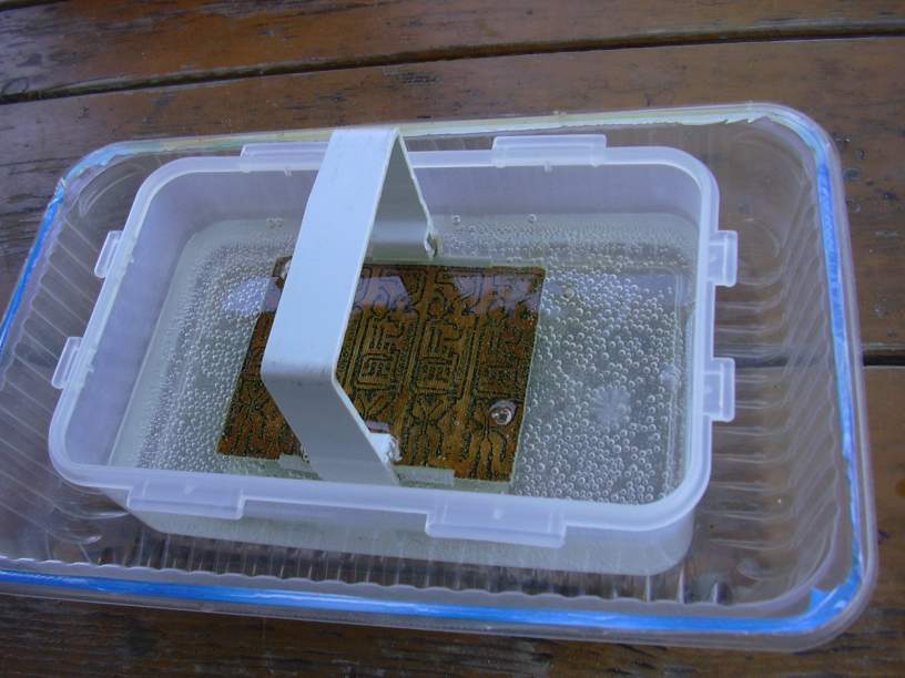 Nun noch die Säure (ohne Schütteln!) abtropfen lassen, dann wird die Platine gewässert. Als erstes Wasserbad wird gleich das vom Papierabweichen genommen. Das Wasser wird mehrfach gewechselt, um sicher zu sein, dass keine Reste der Säure mehr an der Platine sind.