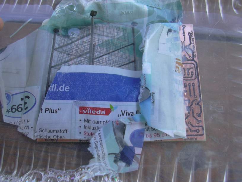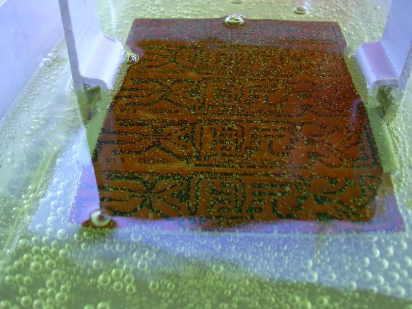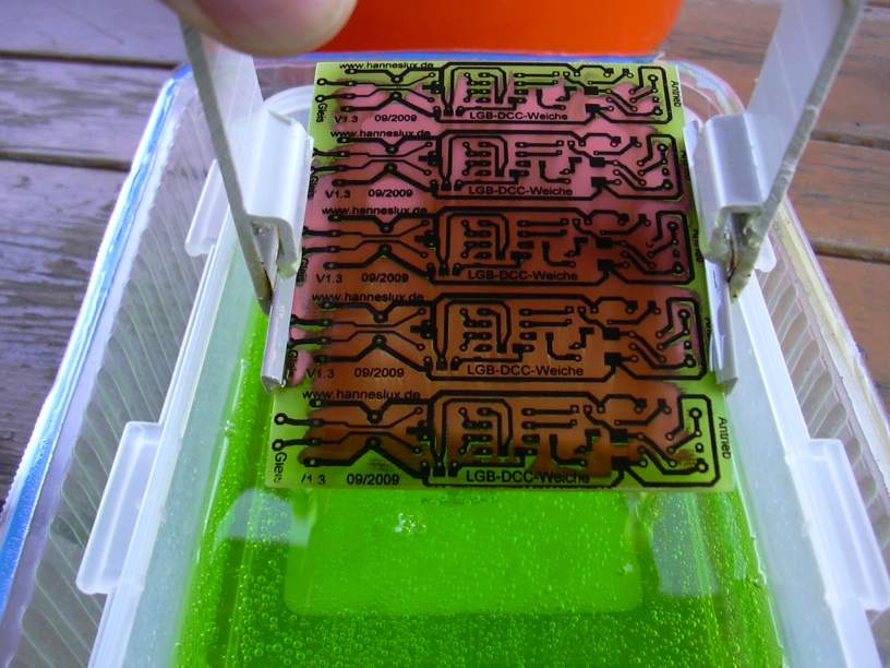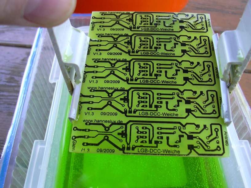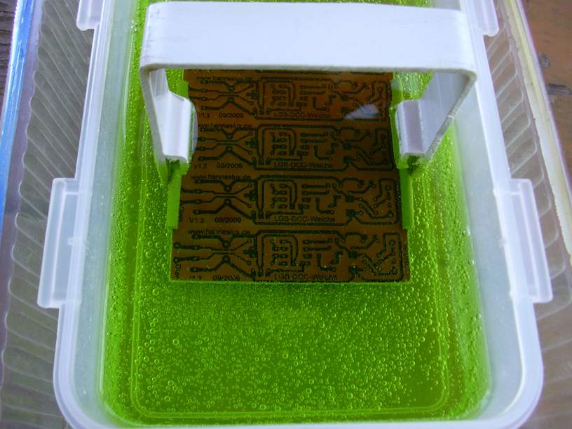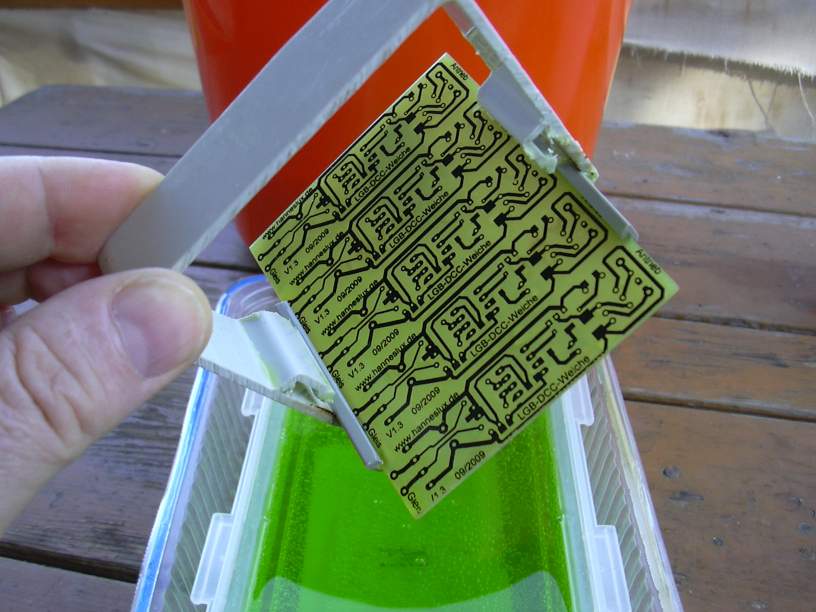 Die Platine wird nun in den Platinenhalter (PVC, Heißkleber) eingeklemmt und in das Ätzbad (verdünnte Salzsäure mit einem Schuss Wasserstoffperoxyd) gelegt.