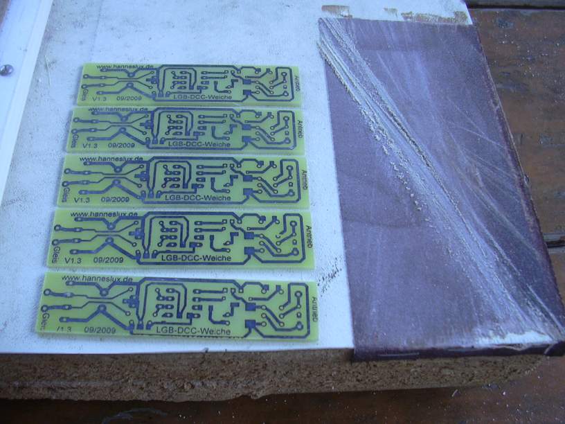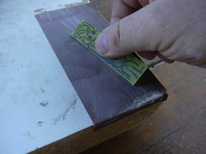 Mit einem Schleifklotz mit sehr feinem Schmirgelleinen wird nun die Kupferschicht gereinigt. Dies ist erforderlich, damit der Toner des Ausdrucks auf der Platine haften kann.