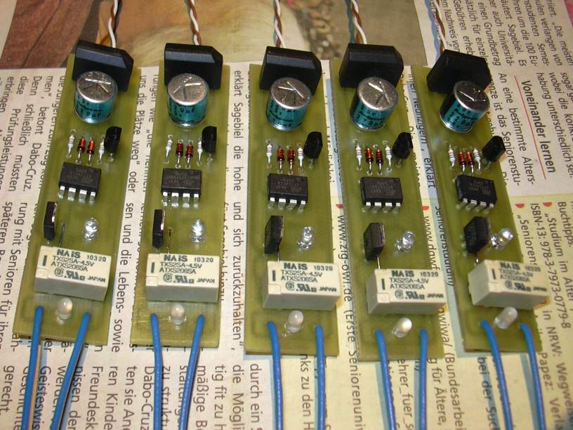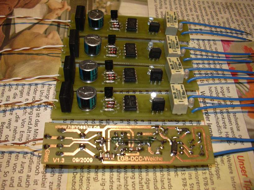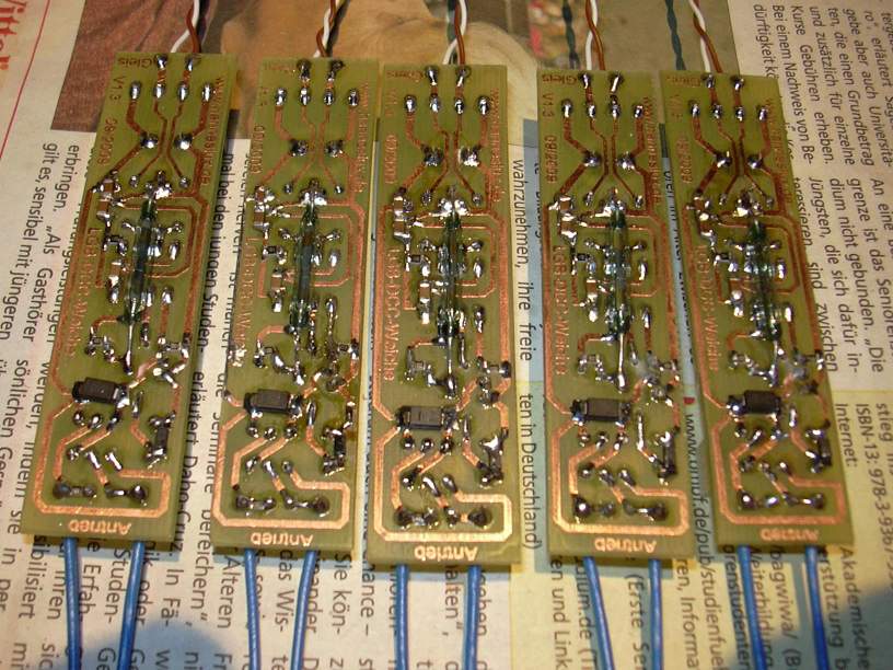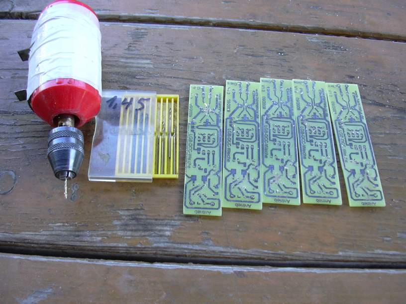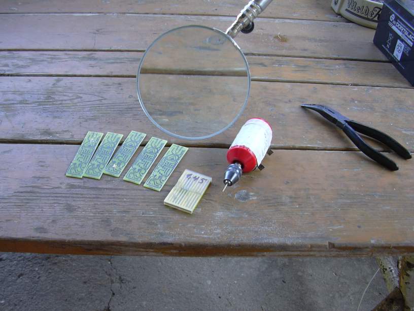 Jetzt kommt die Mini-Bohrmaschine zum Einsatz. Die Bohrdurchmesser betragen 0,7 mm, 0,9 mm und 1,0 mm. Es kommen HSS-Bohrer zum Einsatz, die gelegentlich nachgeschliffen werden. Das Bohren erfolgt unter der Lupe frei Hand.