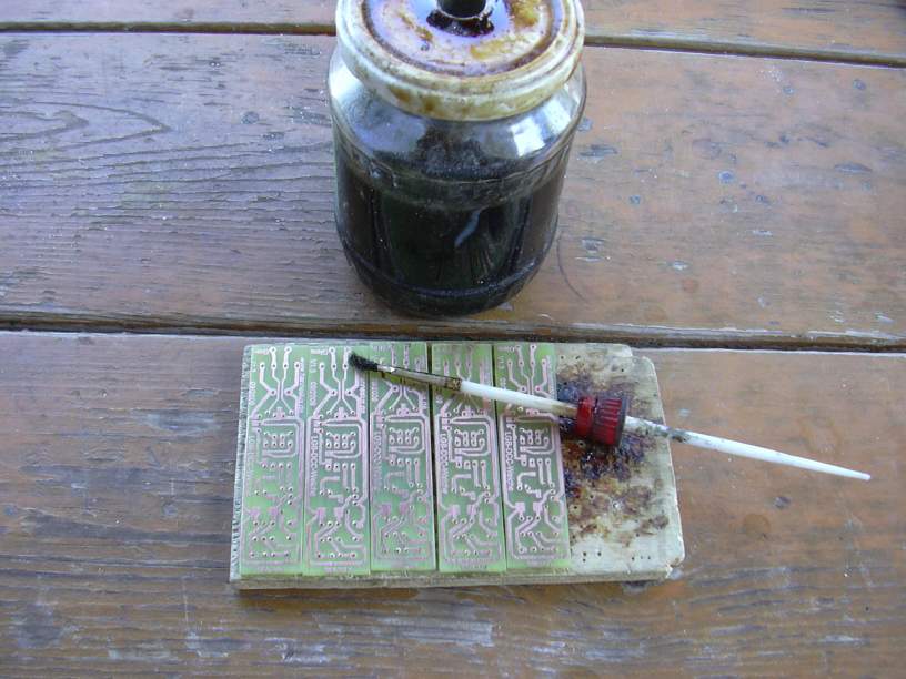 Sofort nach dem Entfernen des Toners wird die Platine mit Lötlack (Kolophonium in Spiritus) behandelt, um das Anlaufen des Kupfers zu verhindern. Es lötet sich dadurch einfach leichter.