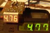 Die Digit-Treibertransistoren für die drei Ziffern (gemeinsame Anode pro Ziffer) liegen alle auf PortB. Auch hier ergab sich die Zuordnung aus dem Layout. Der Eingangsspannungsteiler 9 zu 1 besteht aus 6 gleichen SMD-Widerständen. Die Anschlusspads für Messbereichsumschalter und Dezimalpunkt-Umschaltung waren für Messbereiche 5V und 50V gegen Betriebsspannung als Referenz vorgesehen, bei den Messbereichen 1V und 10V stimmen die Dezimalpunkte nicht, da kann man nur einen Dezimalpunkt im 10V-Bereich nutzen.