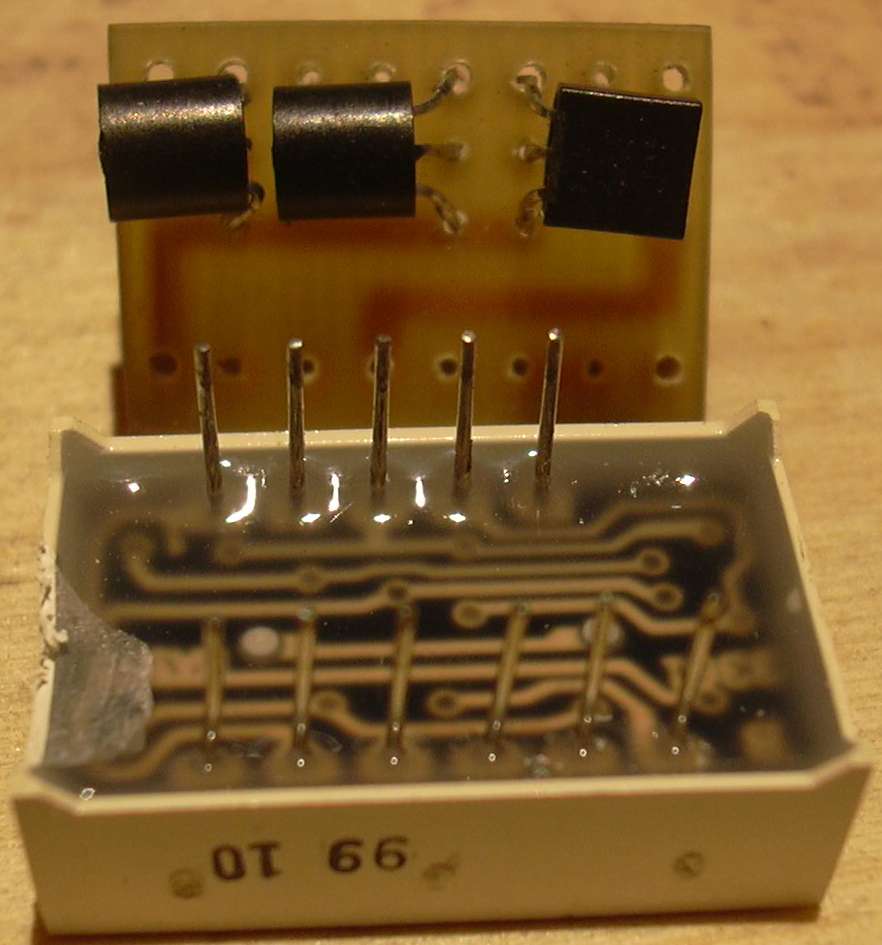 Die Transistoren und Displays sind montiert. Kollektor und Anodenpin stecken in einem gemeinsamen Bohrloch mit 1,0 mm Durchmesser, der Rest (außer den Ecken) ist 0,7 mm gebohrt.