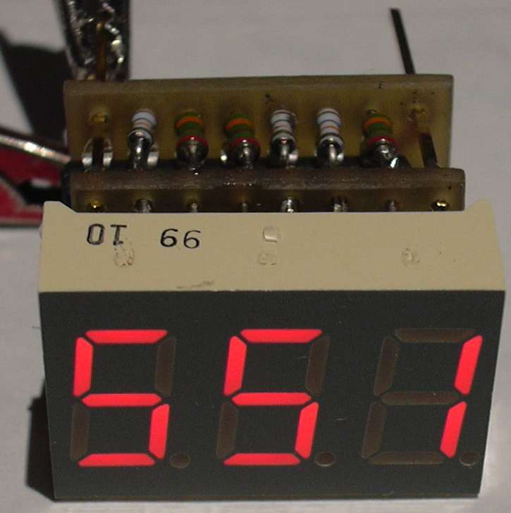 Vorn links sieht man das Lötauge für den Segmentwiderstand des Dezimalpunktes. Dieses kann per Brücke oder Umschalter mit einem der drei Digit-Pins des AVRs verbunden werden, um den betreffenden Dezimalpunkt zu aktivieren. Da alle AVR-Pins an den Lötaugen zugänglich sind, ist es jederzeit möglich, die Schaltung zu erweitern (Widerstände an den Segment-Pins des AVRs zum Anschluss von Tastern oder weiteren ADC-Messquellen gegen interne 1,1V).