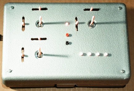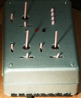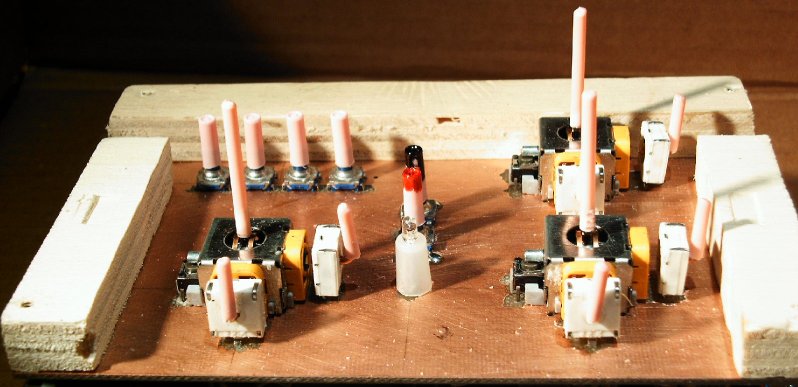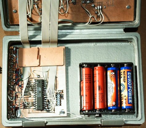 Die größere Platine trägt die Bedienelemente und ist mittels Abstandhalter aus Sperrholz am Deckel des Gehäuses (PVC-Koffer eines Bohrersatzes) angeschraubt. Alle Bauteile sind durch Bohrungen an der Unterseite der Platine angelötet. Jedem Kreuzknüppel-Poti ist ein Radiohm-Trimmpoti parallelgeschaltet, das mit einem Stellhebel versehen ist, der aus dem Gehäuse ragt. Wer in den Stellhebeln (auch der Kreuzknüppel) die PVC-Röhrchen von Wattestäbchen erkennt, hat aufmerksam hingeschaut. ;-) Die 6 Kurzhubtaster sind mit Verlängerungen versehen, die ursprünglich als Schutzkappe von Kanülen für Insulin-Pen dienten. Auch der Abstandhalter für die ultrahelle rote LED ist eine modifizierte Kanülen-Schutzkappe. Die LED wird über einen Widerstand von 910 Ohm betrieben, bekommt also nur 3 mA. Die Taster der Kreuzknüppel werden nicht benutzt. |