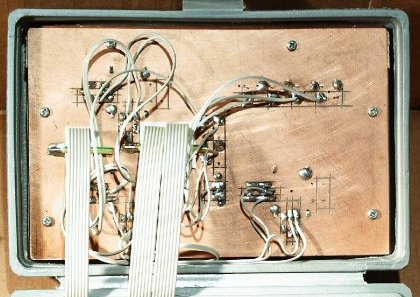 Der mechanische Aufbau......erfolgt wie bei Lochraster, die Platinen haben also hauptsächlich die Aufgabe, die Bauteile mechanisch aufzunehmen. Die "Verdrahtung" der Platinen untereinander erfolgt mittels Schaltdraht bzw. Flachbandkabel. Die Platinen sind aus doppelseitig kupferbeschichtetem Epoxyd-Basismaterial mittels Platinenflex angefertigt, die Trennlinien sind also mit der Diamant-Trennscheibe ausgeschliffen. Die zweite Seite der Platine dient als Abschirmung (Störschutz) und ist mit GND verbunden.