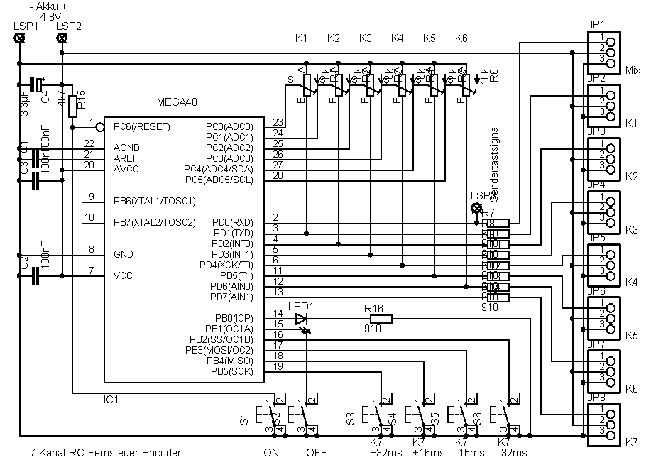 Der Stromlaufplan der Schaltung(zusätzliche Trimmpotis nicht gezeichnet):![]() Der Mega48 wird mit internem Takt von 1MHz betrieben (Auslieferungszustand, 8MHz intern und aktivierte CKDIV8-Fuse). Sollte das auf die Dauer zu ungenau sein, lässt sich immer noch ein Quarz nachrüsten, die dazu benötigten Anschlusspins wurden nicht benutzt. Um wegen Batteriebetrieb Energie zu sparen werden die Potis nicht direkt an die Versorgungsspannung gelegt, sondern an den Impulsausgang des jeweiligen Kanals und GND. An einem Poti liegt also nur dann Spannung an, während es abgefragt wird. Somit fließt immer nur durch ein Poti Strom. Als Potis werden Mini-Kreuzknüppel verwendet, die einen Widerstand von 10k haben. Diese Potis haben einen eingeschränkten Widerstandsbereich (60°), liefern also am ADC die Werte von 0 bis 1023. Allerdings sind die Werte in Mittelstellung nicht exakt 511, wodurch eine Trimmung nötig wird, die mit (im Stromlaufplan nicht eingezeichneten) parallel geschalteten Trimmpoti 22k realisiert wird, dessen Stellbereich mechanisch (durch das Gehäuse) auf die mittleren 60..90° begrenzt wird. Die Kanalimpuls-Ausgänge werden über Widerstände 1k (naja, 910 Ohm, da ich davon eine Rolle in SMD habe) nach außen geführt, um Servos oder andere RC-Baugruppen zu Testzwecken direkt anschließen zu können. Für Kanal 7 werden an PB2..PB5 vier Taster gegen GND angeschlossen. Mit diesen lassen sich (zum Neutralwert von 1,5ms) Impulsverkürzungen/verlängerungen von 0,16ms und 0,32ms (zusammen 0,48ms) erreichen. Das ermöglicht 7 Servostellungen (mit Neutralstellung) oder bei geeignetem Schaltdecoder 4 oder 6 Schaltkanäle. Für die Taster werden die internen PullUps verwendet, die nur während der Abfrage aktiviert werden um Strom zu sparen. Ein weiterer Taster an PB1 dient zum Abschalten des Gerätes. Wird er betätigt, werden alle Komponenten des AVRs deaktiviert und der Sleep-Mode "Power Down" eingeschaltet. Zum Einschalten wird ein Taster am Reset-Pin benutzt. Eine LED an PB0 signalisiert durch kurzes Aufblitzen, dass das Gerät eingeschaltet ist. Eine Anzeigeperiode besteht aus 16 Lichtblitzen innerhalb von 5,12 Sekunden. Diese Lichtblitze können extrem kurz (0,5ms) oder recht lang (160ms) sein, die Anzahl der langen (deutlich helleren) Blitze gibt Auskunft über den Akkuzustand. Ein langer Blitz pro Periode zeigt einen vollen Akku an, je leerer der Akku wird, desto öfter blitzt es lang. Bei kritischem Akkuzustand wird das Gerät ausgeschaltet (Power Down). |