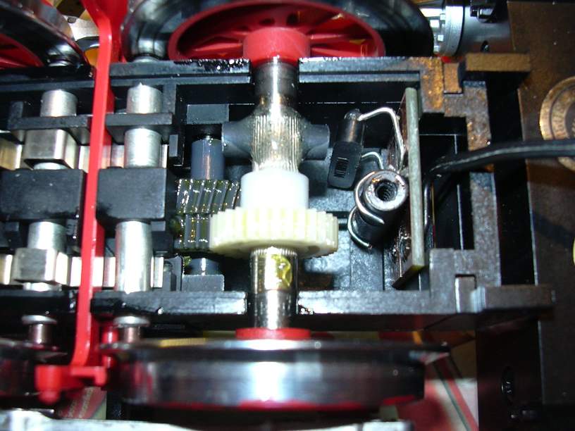 Hier unter dem Zylinderrahmen sind die Reedkontakte für Bimmel und Pfeife. Auf der Platine ist auch der Anschluss des im Getriebe befindlichen Radsensors (schwarzes Kabel).