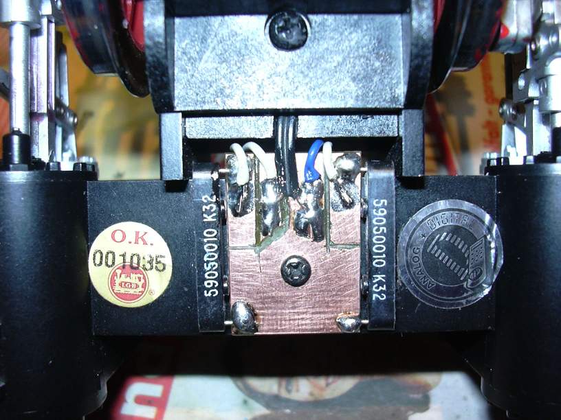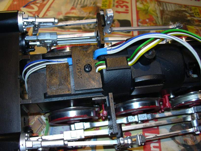 Das Drehgestell von oben. Die zusätzlichen Strippen werden vom Deckel des Anschlusskastens gehalten, der dazu ein paar Kerben mit der Flex bekam. Ein Stück blauer Schrumpfschlauch schützt vor Durchscheuern und Kontakt mit den Fahrwerksanschlüssen.