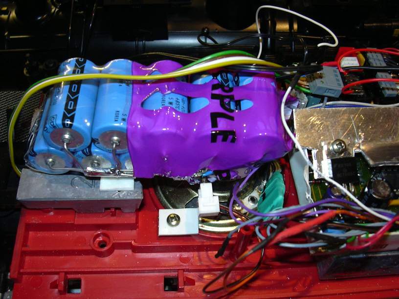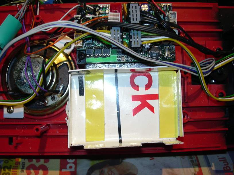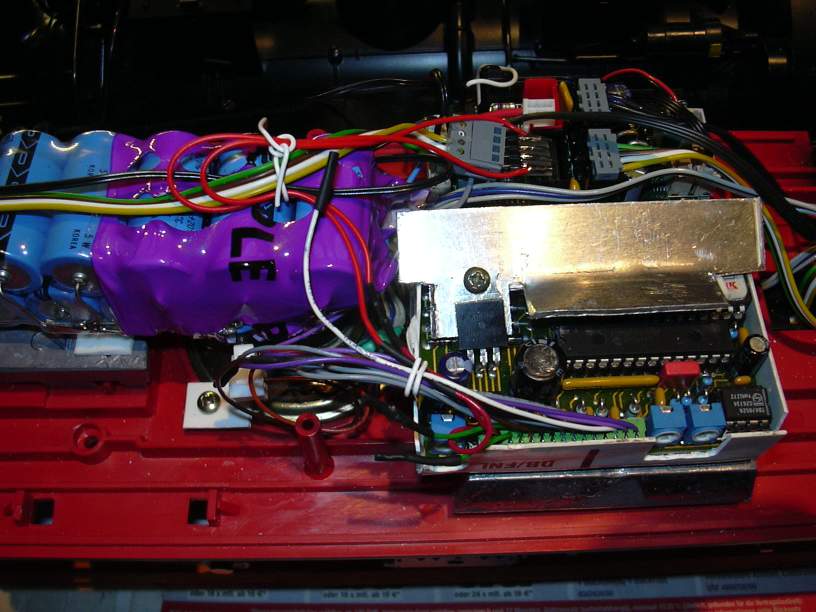 Das Elko-Paket wurde in (transparenten) Schrumpfschlauch eingepackt. Da der Einsatz einer Diode zwischen Soundanschluss des Onboard-Decoders und Elko norwendig wurde, musste ein Teil des Schrumpfschlauches wieder entfernt werden (nur an den Stellen, an denen nochmals gelötet wurde). Dies wurde dann mit dem lila Schrumpfschlauch abgedeckt, der allerdings dünner ist und nicht so viel Temperatur verträgt. Egal, er erfüllt seinen Zweck. Das Elko-Paket ist mit doppelseitigen Klebepads auf dem Gewicht (links) und dem Lautsprechermagneten (rechts) fixiert. Der Steckanschluss des Soundmoduls ist oberhalb des Lautsprechers zu sehen.