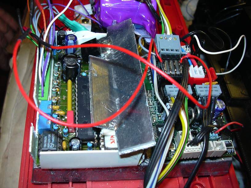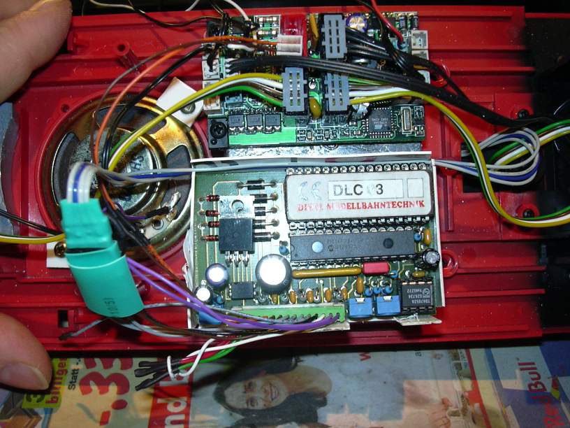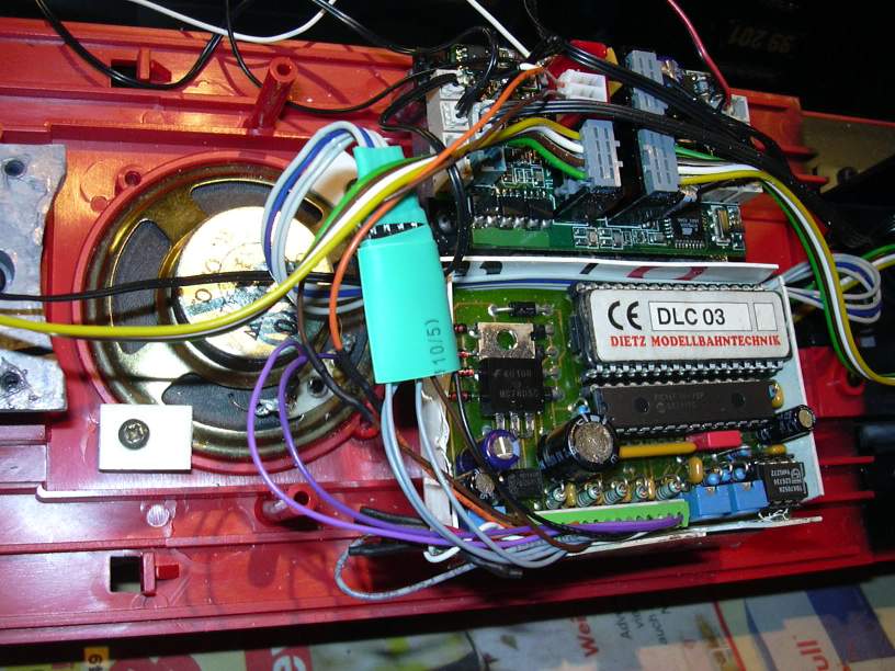 ...Dachte ich, doch bei der Funktionskontrolle bemerkte ich, dass dieses Soundmodul ganz anders reagiert, als das, was ich zur Reparatur auf dem Tisch hatte (es war ein Schieberegister-IC kaputt) und in eine auf Akkubetrieb umgebaute Lok eingebaut hatte. Dieses Modul hier schaltete sich einfach nach 4 Minuten und 16 Sekunden aus, egal, ob der Radsensor Dampfausstöße auslöste oder nicht. Es war auch egal, ob ich die Stromversorgung über den Gleisanschluss des Soundmoduls oder über den Batterieanschluss realisierte. Auch ein Versuch, die Versorgungsspannung des Moduls mit einem Elko-Paket (10 x 1500 Mikrofarad) zu puffern, brachte keinen Erfolg. Den Motor hatte ich nicht angeschlossen, weil das beim anderen Modul auch nicht nötig war und weil ich dem Modul die Geschwindigkeit ja über den Radsensor mitteilte.