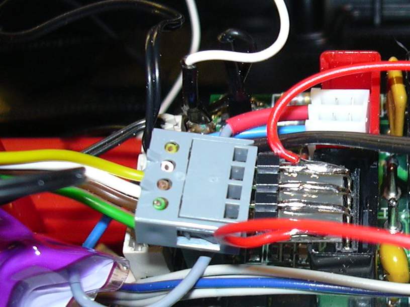 Hier ist dasselbe nochmal aus einer anderen Perspektive... Der dicke grüne Schrumpfschlauch wird erst geschrumpft, wenn ich sicher bin, dass Glocke und Pfeife richtig herum beschaltet sind.
