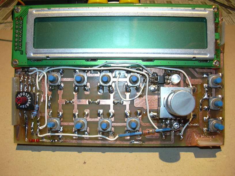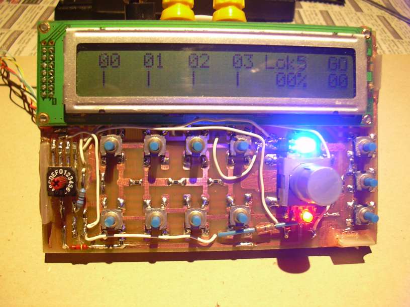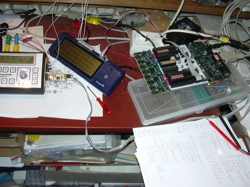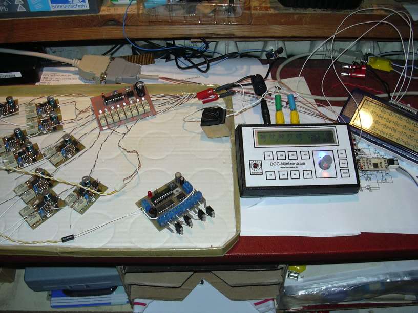 Ein Blick auf den Testaufbau. Links sind "alle Neune", also die bisher existierenden 9 Einzeldecoder für Gartenbahnweichen. Der auf den Strippen liegende 4-fach-Motorweichendecoder ist derzeit nicht angeschlossen. Ganz vorn ist ein Lexa-Decoder für Doppelspulenantriebe, dessen Funktion mit LEDs überprüft wird. Die SUB-D-25-Stecker/Kupplung sind der Anschluss zur LA4, der 4-Kanal-Logik-Anneliese auf dem 486er Fräsen-PC. Rechts steht die Mini-Zentrale, rechts daneben die Debug-Hilfe mit LCD 4x27 und Mega8 im Optipen-Etuie.