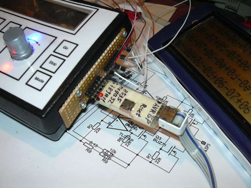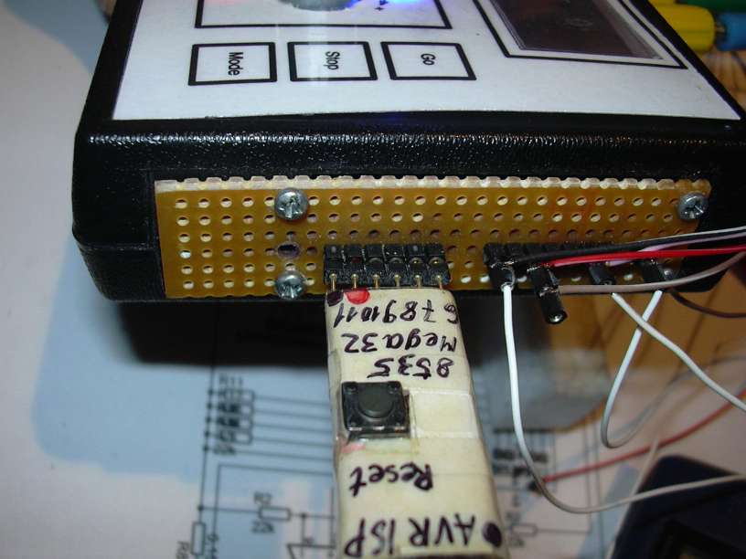 Damit das Strippengewirr ein Ende hat, wurde ein Stück Lochraster spendiert, in dem Steckbuchsen für ISP (links, da wo der 8535-ISP-Adapter drin steckt) und weitere Portpins (rechts, da stecken LA-Strippen drin) montiert sind. Das Gerät wird damit erstmal "tragbar".