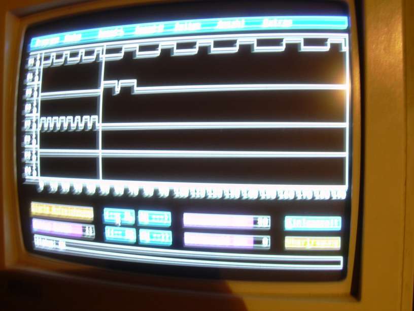 LA4, die 4-Kanal-Anneliese auf dem 486DX2-66 unter MS-DOOF622 hat bei der Implementierung der DCC-Routine geholfen. Man sieht den Rest der Präambel, das Startbit (0) und die ersten 5 Bits des ersten DCC-Bytes (Inhalt $07, also Loktelegramm für Lokadresse 7). Das Bild ist zwar grausam, aber beser als nix.
