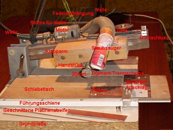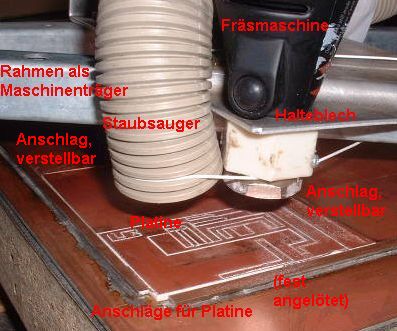 Diese Fräse ist keinesfalls für Dauerbetrieb geeignet, aber bei mir fallen nicht mehr als die Fläche von 1...2 Europlatinen (natürlich in kleineren Einheiten) im Monat an. Bei zweiseitig wird es arg kritisch, SMD geht garnicht. Bohrlöcher werden nicht durchgebohrt sondern nur angefräst, also etwas besser als angekörnt. Das bohrt sich dann aber gut von Hand. |