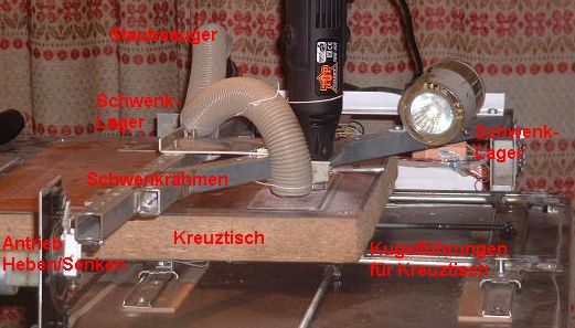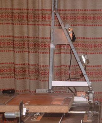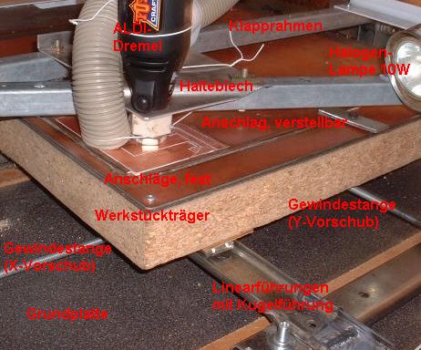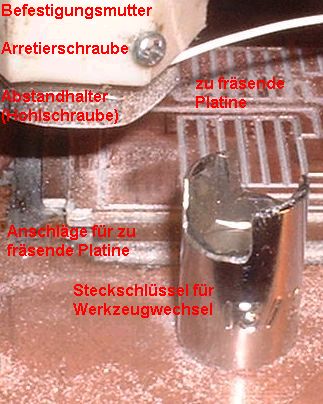 ![]() Der Kreuztisch mit der zu fräsenden Platine wird von den Vorschubspindeln unter dem Fräser hinweg bewegt. |