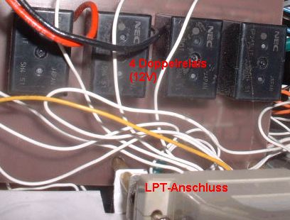 ![]() Das Bild zeigt die Relais auf der Ansteuerplatine. Sie werden mittels Transistoren BC337 vom Printerport angesteuert. Die Anschlussbelegung des Printerports erfährt man übrigens im Menüpunkt INFO im Steuerprogramm. |