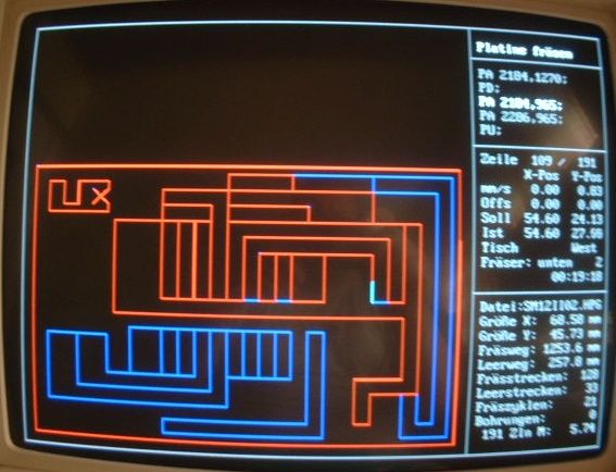 ![]() Hier ist der Fräser bei der Arbeit, zu Bedienen gibt es jetzt nix, es wird nur der Fortschritt der Arbeit visualisiert... Rot ist fertig, blau muss noch, weiß ist gerade in Arbeit. Der Fräser ist rechts mittig Richtung "unten" unterwegs, der fertige Teil der Trennlinie ist rot, der noch zu fräsende Teil ist weiß. Da Eagle eine etwas umständliche Reihenfolge der Fräslinien errechnet, sind einige Linien vergessen worden, die später erst gefräst werden. Eagle meint wohl, dass sich Plotter über Leerfahrten freuen... Rechts oben auf dem Bildschirm sieht man 5 Zeilen der HPGL-Datei, die mittlere wird gerade abgearbeitet. Rechs mittig sieht man aktuelle Angaben zum Arbeitsfortschritt wie Vorschubtempo, Offset zum Tisch-Nullpunkt, Zielposition, Ist-Position, Bewegungsrichtung (soll "west" heißen) Fräserstatus (unten, Stift 2) und bisher gebrauchte Zeit. Rechts unten sind einige statistische Angaben zur Platine wie Größe, Fräsweg usw... Auch in den anderen Menüpunkten des Programms wird links das Fräsbild und rechts das Menü gezeigt. Im Dateimenü gibt es statt des Fräsbildes allerdings das Dir, aus dem man per Cursor die zu ladende Datei auswählt... |