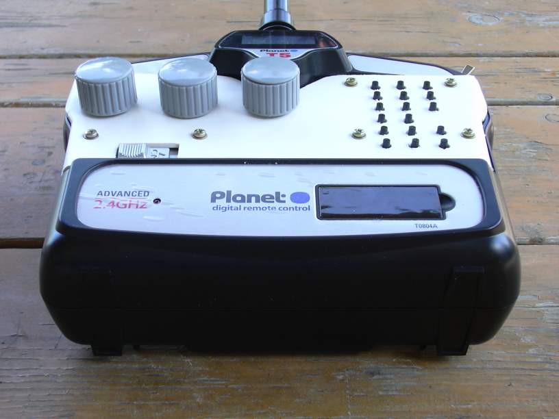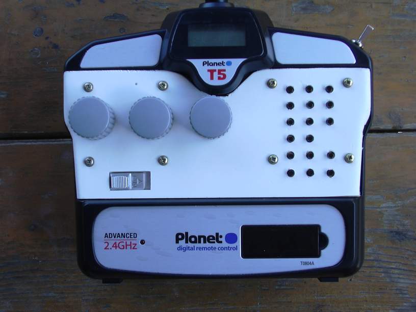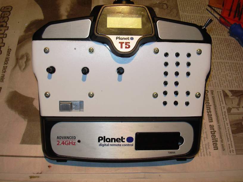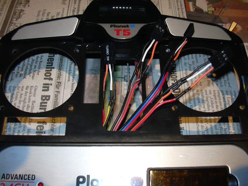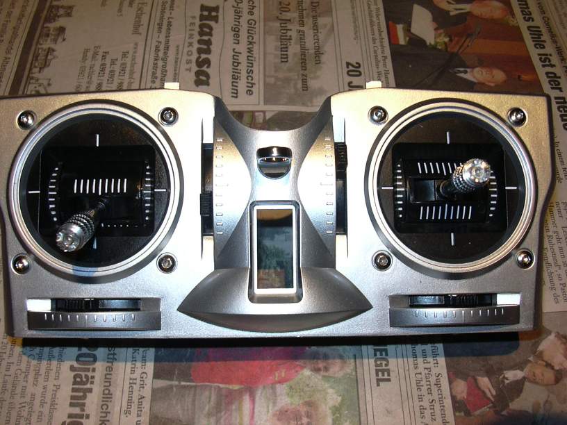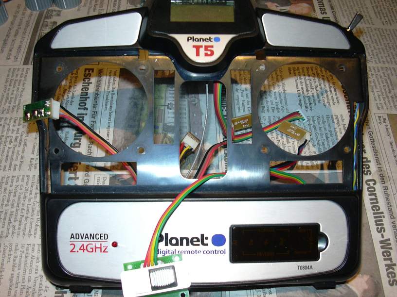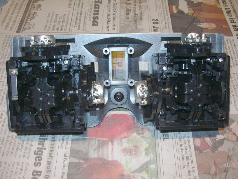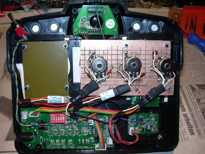 Blick von unten in die Oberschale: Links ist der Tastenblock zu sehen, rechts die 3 Potentiometer (10 k linear) für die Kanäle 2, 3 und 4, also die 3 Fahrkanäle. Die Potis sind leicht schwenkbar montiert, mit den Poti-Achsen können duch Seitwärtsbewegungen Taster betätigt werden. Der Stellbereich ist elektrisch begrenzt worden, die Begrenzungswiderstände (1 k) mussten aufgrund der Nichtlinearität an den Enden auf 2 k erhöht werden. Der Fahrtregler am Empfänger interpretiert dann nur den begrenzten Bereich als Fahrsignale, die elektrischen Endlagen werden durch Taster erreicht und als Funktionskommandos (z.B. Auslösung von Geräuschen) interpretiert. Da die Auswertung ja im Decoder (Fahrtregler mit Zusatzfunktionen und Fahrzeugpark-Verwaltung) erfolgt, lassen sich dort auch Mehrfach-Tastendrücke auswerten.