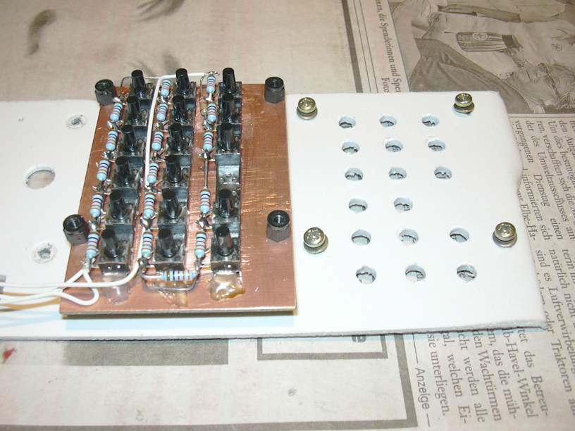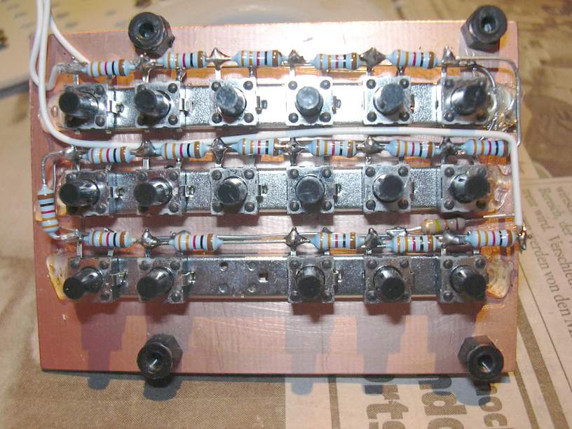Kanal 1 (war zuvor der Gashebel) erhält statt eines Potis einen Tastensatz (17 Tasten) mit Spannungsteiler. Der Spannungsteiler wurde aus 17 gleichen Widerständen 331 Ohm zusammengesetzt. Dies erwies sich aber als Fehler, denn die Software des ATMega8 behandelt die Enden des ADC-Messbereiches nicht linear. Nach Austausch des ersten und letzten Widerstandes gegen 682 Ohm ist der gesamte Bereich recht linear und am Empfänger gut auswertbar (8 Timerschritte von Taste zu Taste).