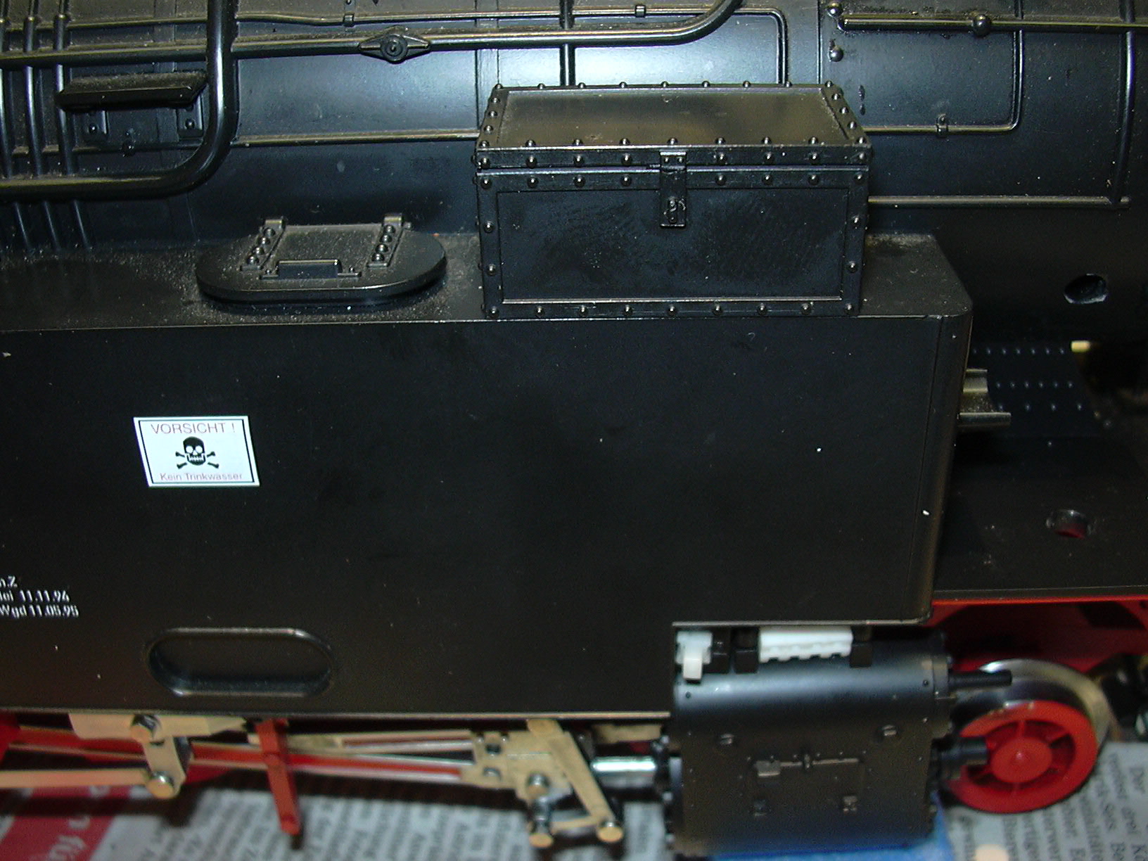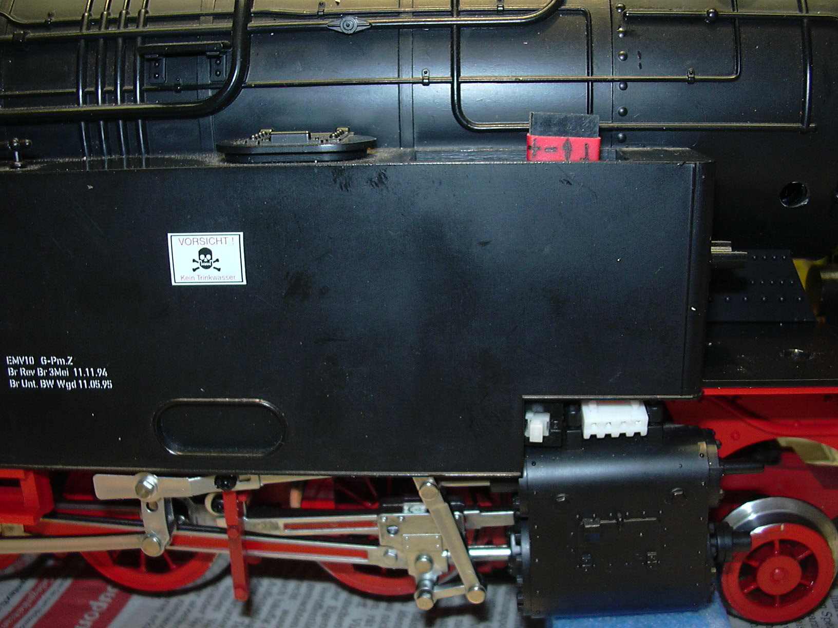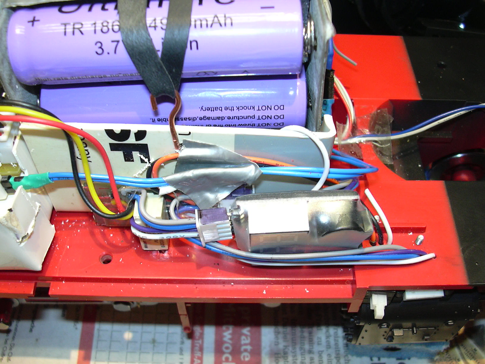 Der Kasten rechts ist mitsamt dem darin befindlichen Dietz-Soundmoduls mit 4 Schrauben am Rahmen angeschraubt. Das Soundmodul ist mit einer PVC-Platte abgedeckt, um es gegen versehentlichen Kurzschluss mit dem darüber angeordneten Lokfahrtregler zu schützen. Lokfahrtregler und Batteriekasten sind mit Spanngummis fixiert. Die Batteriekammer für 6 Li-Ionen-Zellen der Bauform 18650 enthält einen aus Blei gegossenen Kern...
