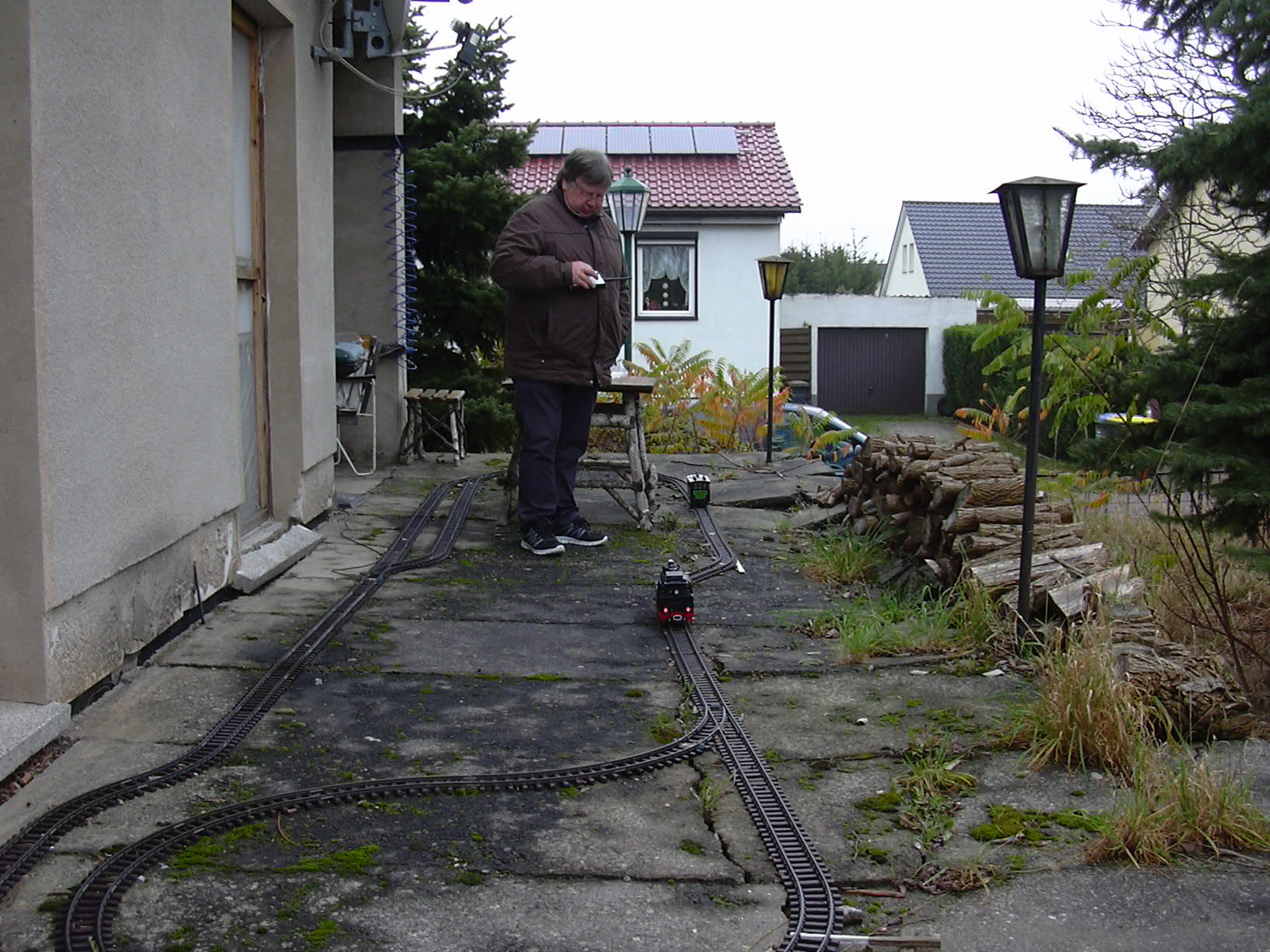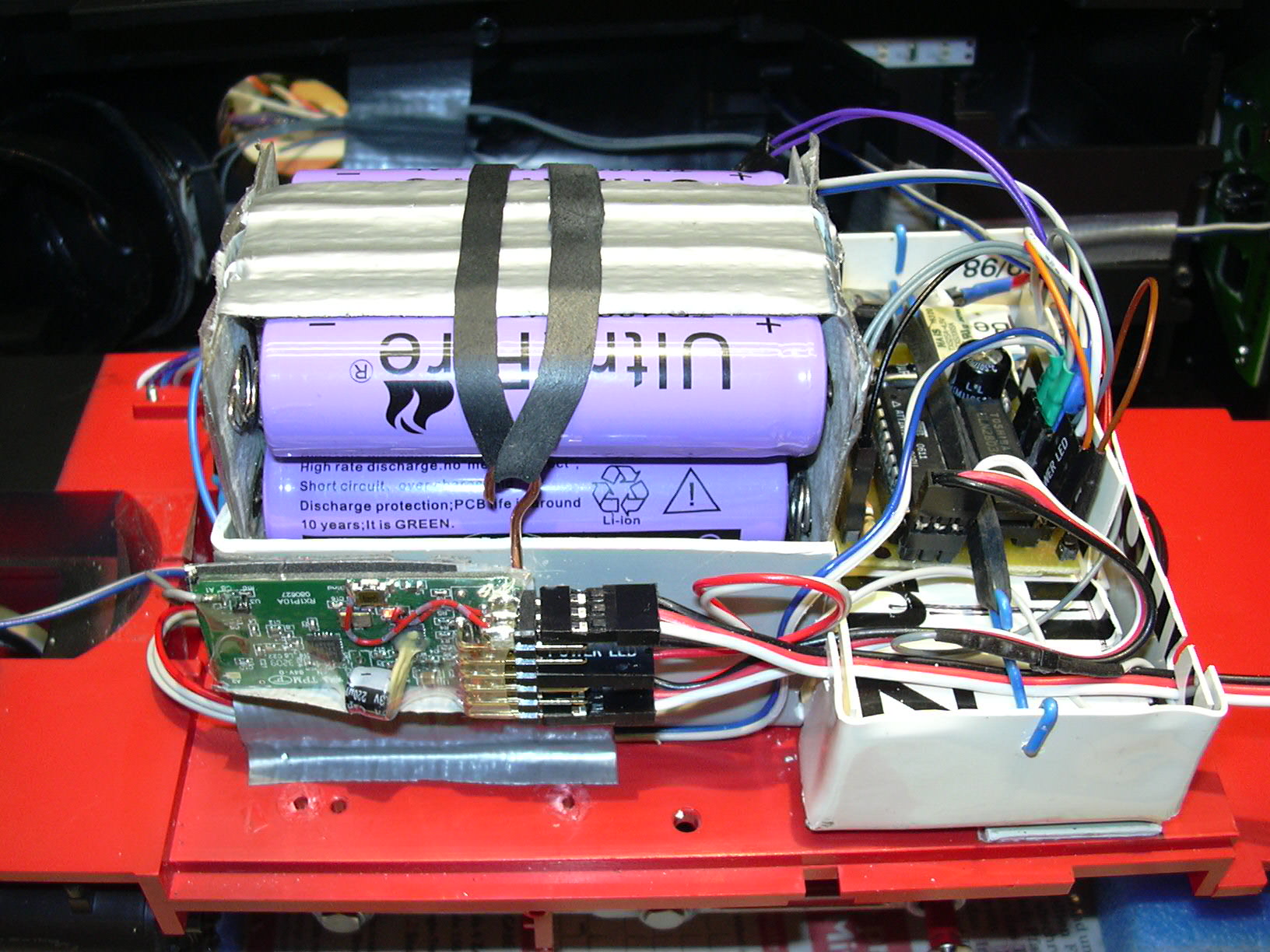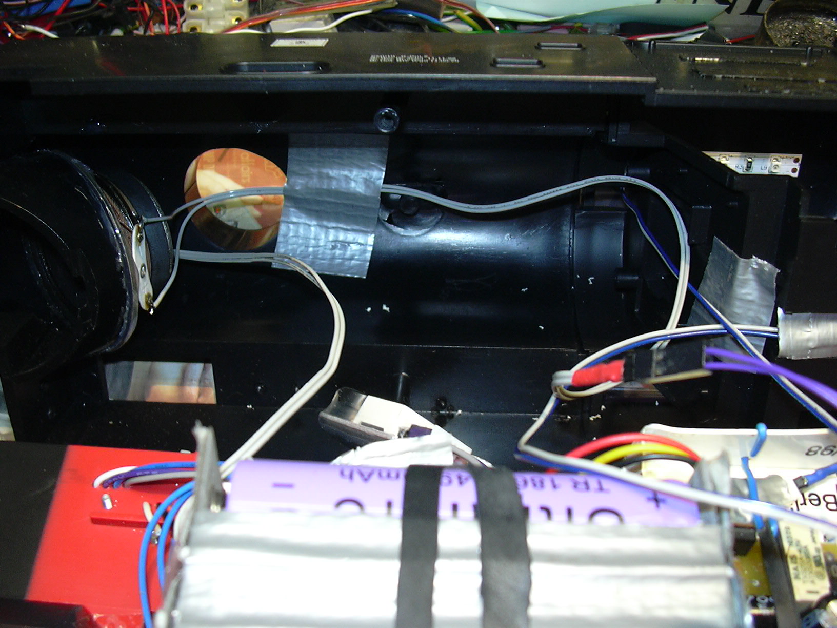 Der Kasten rechts ist mitsamt dem darin befindlichen Dietz-Soundmoduls mit 4 Schrauben am Rahmen angeschraubt. Das Soundmodul ist mit einer PVC-Platte abgedeckt, um es gegen versehentlichen Kurzschluss mit dem darüber angeordneten Lokfahrtregler zu schützen. Lokfahrtregler und Batteriekasten sind mit Spanngummis fixiert. Die Batteriekammer für 6 Li-Ionen-Zellen der Bauform 18650 enthält einen aus Blei gegossenen Kern...