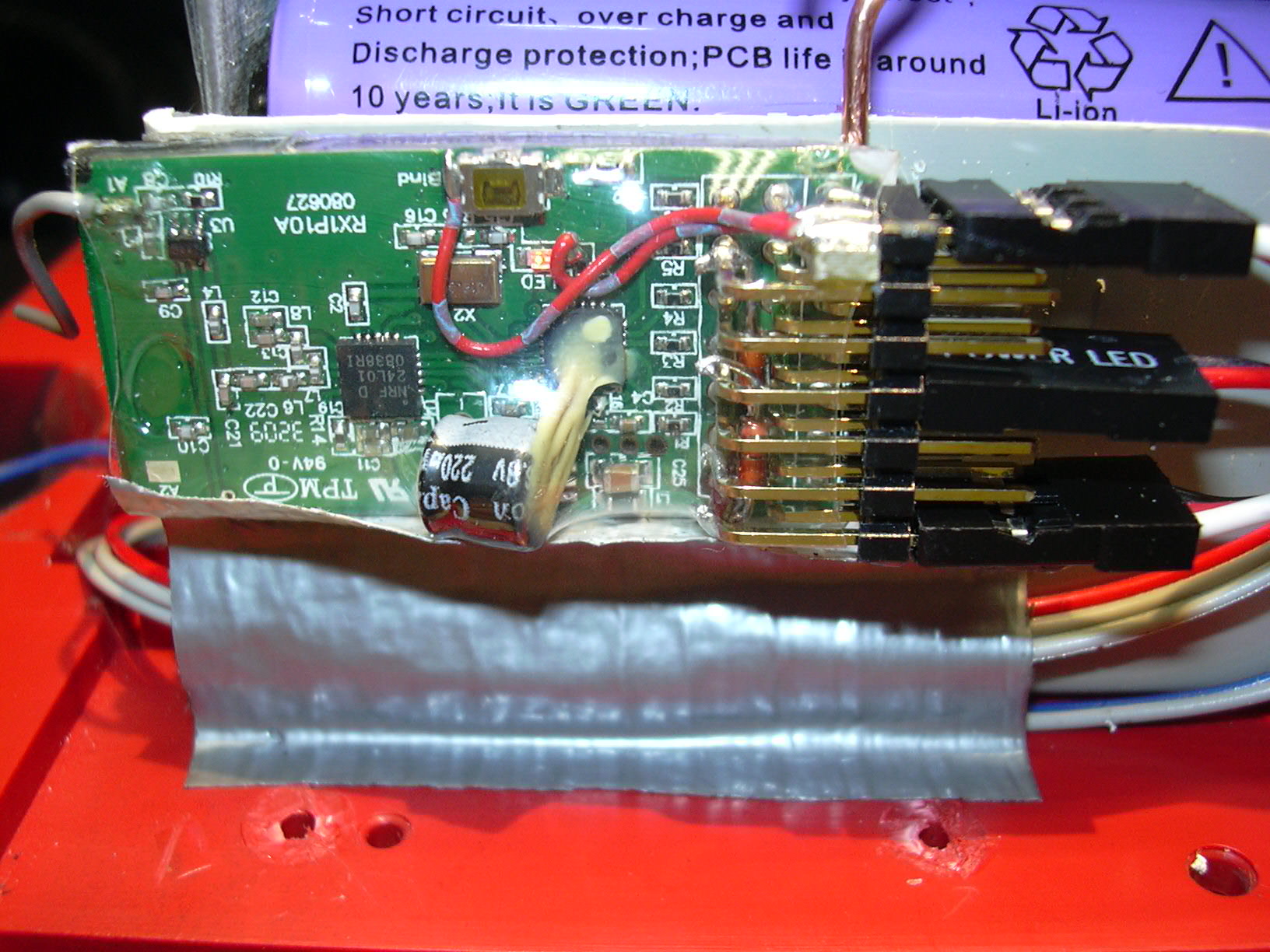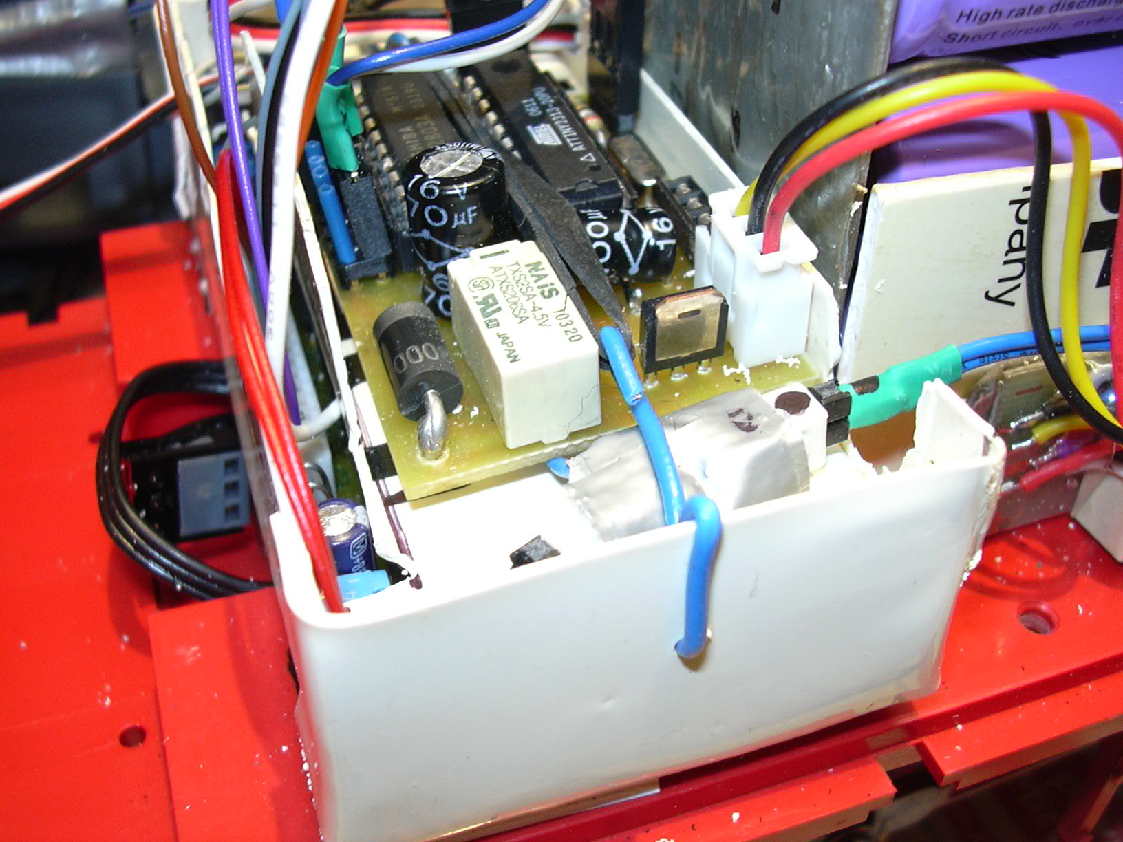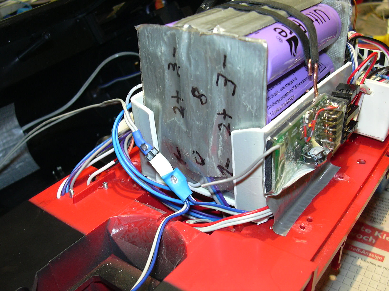 Die Elektronik-Komponenten sind rund um die Eigenbau-Batteriekammer angeordnet. Unten sieht man den modifizierten Funkempfänger der Marke "Planet R6m" mit seinen Anschlüssen für Summensignal und externes Binding. Der Funkempfänger wurde auch gleich als Stromquelle für den Hallsensor (mittlerer Steckverbinder) missbraucht.