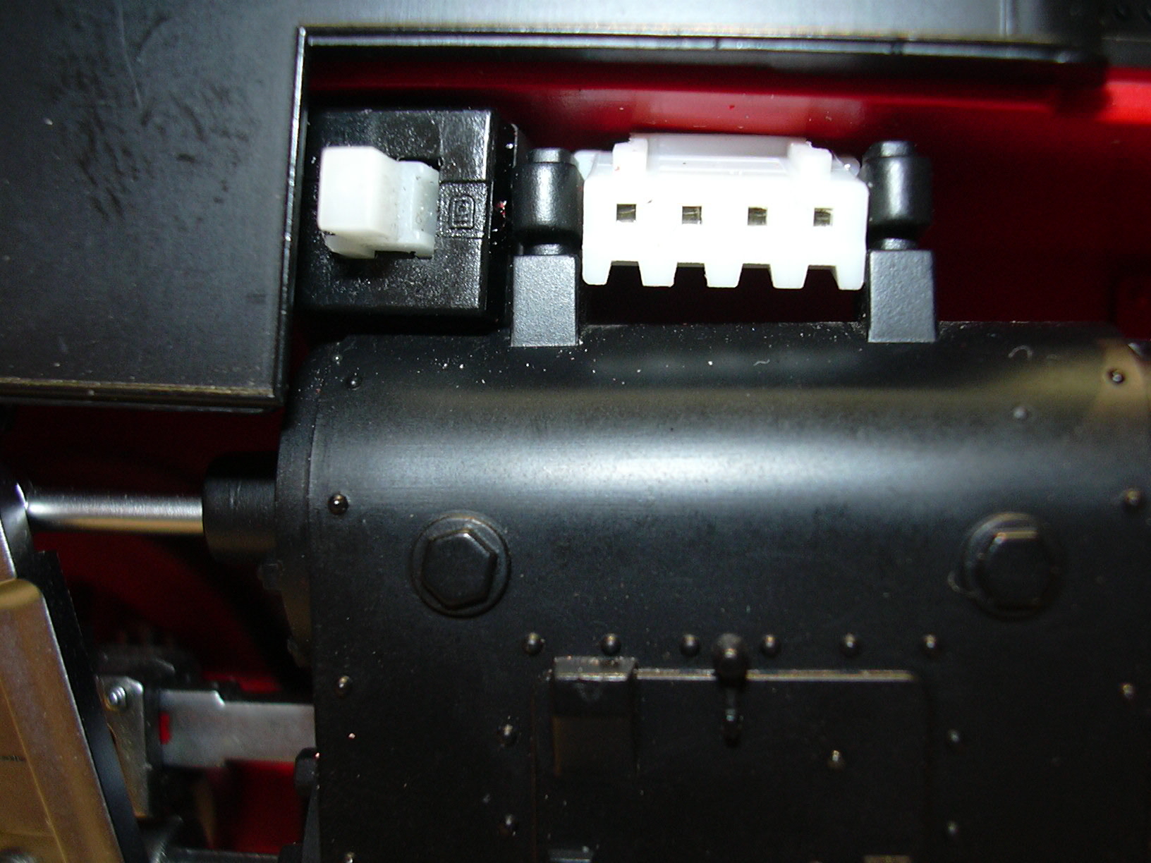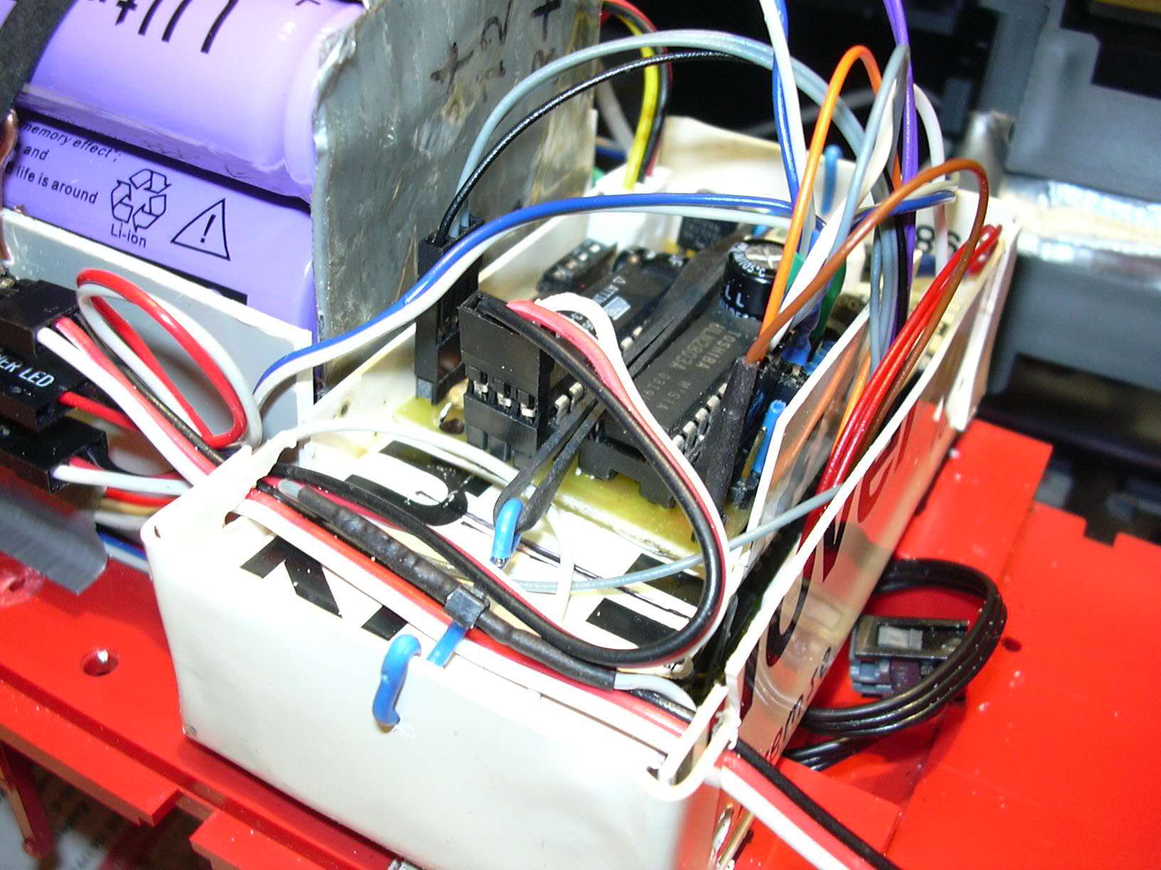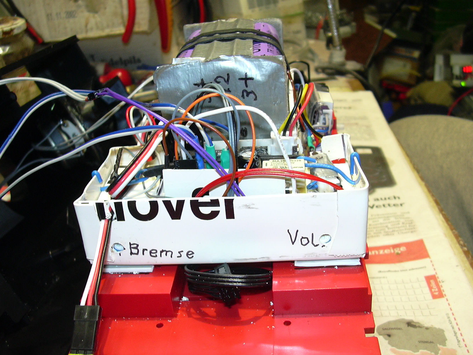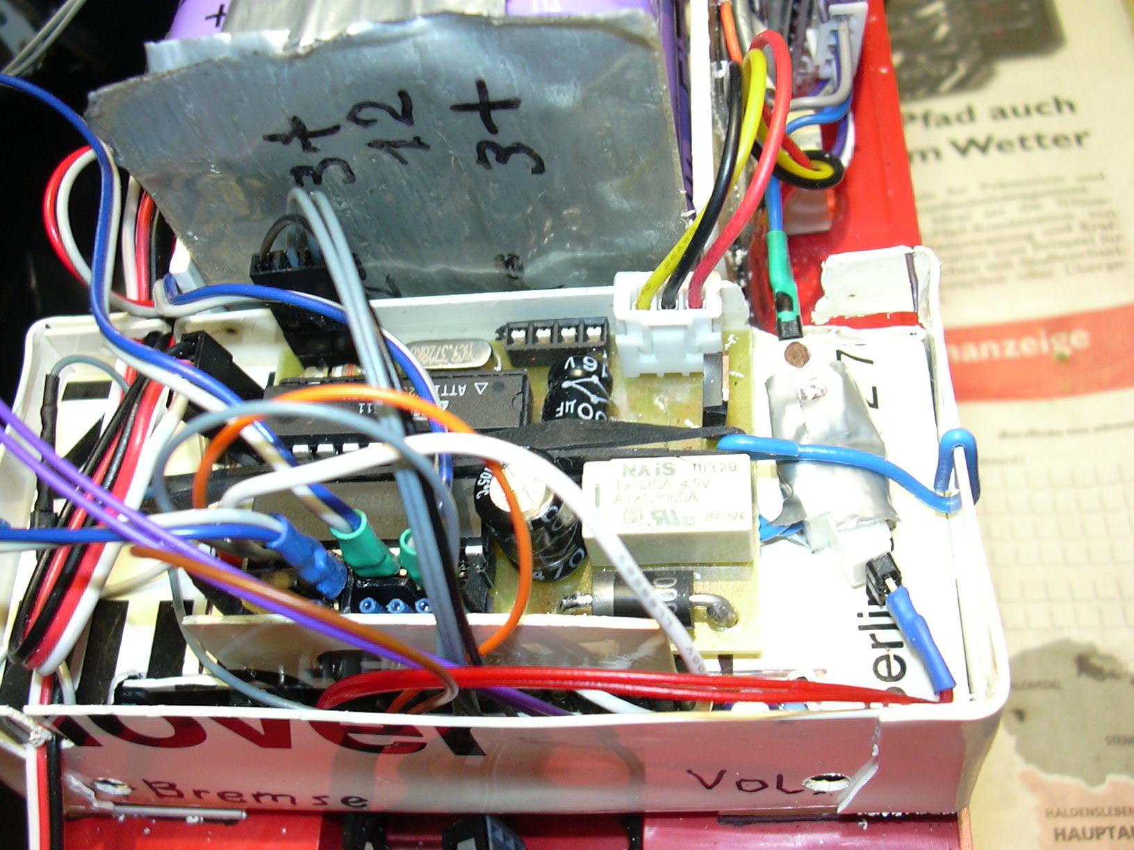 Links neben dem Controller ist der Funkempfänger angeschlossen. Oberer Platinenrand von links nach rechts: Soundmodul-Steuerleitungen, Quarz, (serielle) RS232-Schnittstelle und Stromversorgung. Rechts neben der Platine Anschluss für Motor und Soundsteuerung. An der unteren Kante der Platine sind Anschlüsse (von links nach rechts) für: 3 Schaltfunktionen (2 zum Soundmodul, die dritte zur Führerstandsbeleuchtung), Scheinwerfer hinten und Scheinwerfer vorn. Der Kabelbaum im Vordergrund führt zum Soundmodul unter der Zwischendecke.