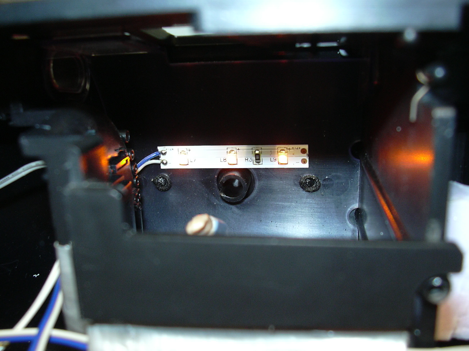 Links ist das Kabel zur Bedieneinheit (Taster/LED) des Bindings. Mittig unter der Kiste ist das Kabel vom originalen Hallsensor. Dieser macht 4 Kolbenschläge pro Achsumdrehung, was zwar korrekt ist, hier aber nicht erwünscht ist. Hier bevorzugt man 2 Kolbenschläge pro Umdrehung, da man möglicherweise etwas zu schnell fährt. Daher wurde ein eigener Hall-Sensor mit nur 2 Magneten nachgerüstet. Wenn man eine (zweizylinder) Dampflok von der Seite beobachtet, hört man ja auch nur die Zylindergeräusche dieser einen Seite laut, die der anderen Seite gehen im Getöse unter. (Prima Ausrede, gelle?)