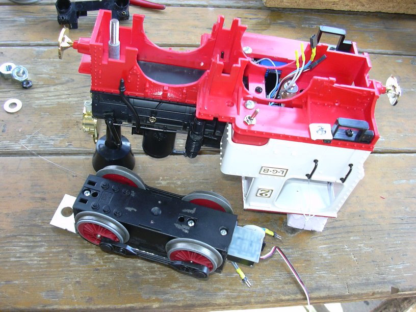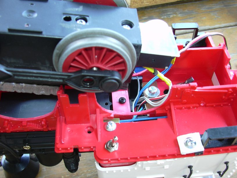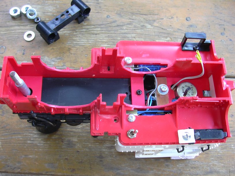Dieses wurde an das Playmobil-Triebwerk angepasst. Dazu wurden erstmal die Radausschnitte vergrößert, da der Radstand um wenige Millimeter differierte und auch recht wenig Platz zwischen Getriebegehäuse und Radscheiben war. Dann musste noch ein Batterieschalter und eine Ladebuchse eingebaut werden (unten rechts zu sehen). Unter dem Führerstand wurde eine Bohrung für den Lautsprechermagneten angebracht, davor (also links daneben) eine Verstärkung aus Platinenmaterial und die fest justierte M4-Schraube mit U-Scheibe, an der das Triebwerk hinten fixiert wird.