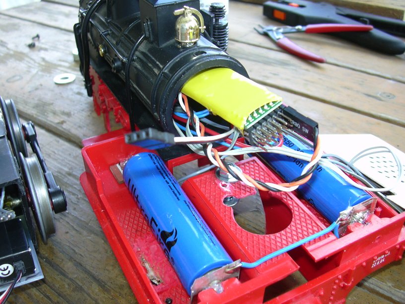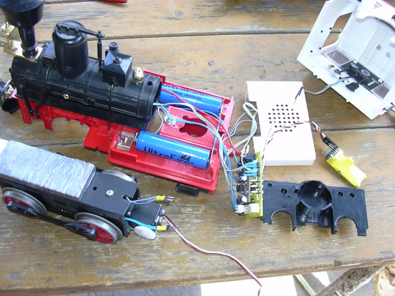 Das alles muss zusammen, vorerst mit einem normalen Dreizeller-Fahrtregler, wie er inzwischen in etlichen Gartenbahn-Lokomoteufelchen und Lokomofanten seinen Dienst tut. Es wurde erstmal nur der Spannungsregler 78L05 überbrückt und alles aus 3,7 V (4,2 V bei vollem Akku, 3,0 V bei leerem Akku) gespeist.
