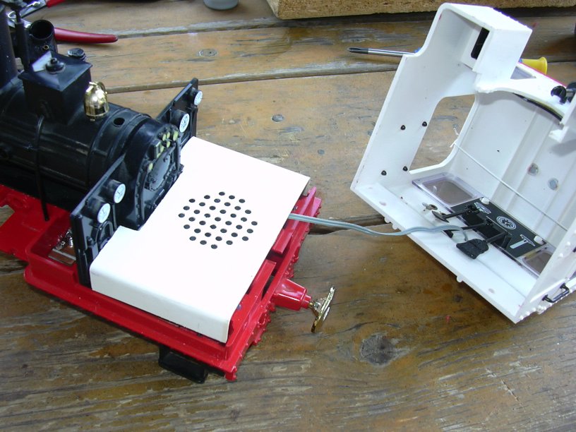 Fahrtregler und Soundmodul (darunter, Aufsteckmodul) werden in den Kessel geschoben. Die beiden im Boden des Führerstandes sichtbaren Akku-Zellen sind parallel geschaltet, das erhöht die Kapazität und damit die Funktionsdauer.