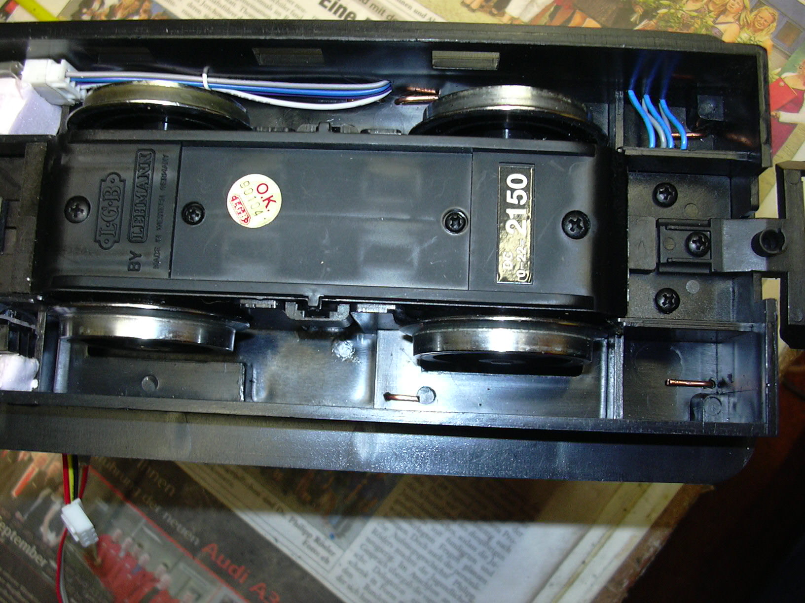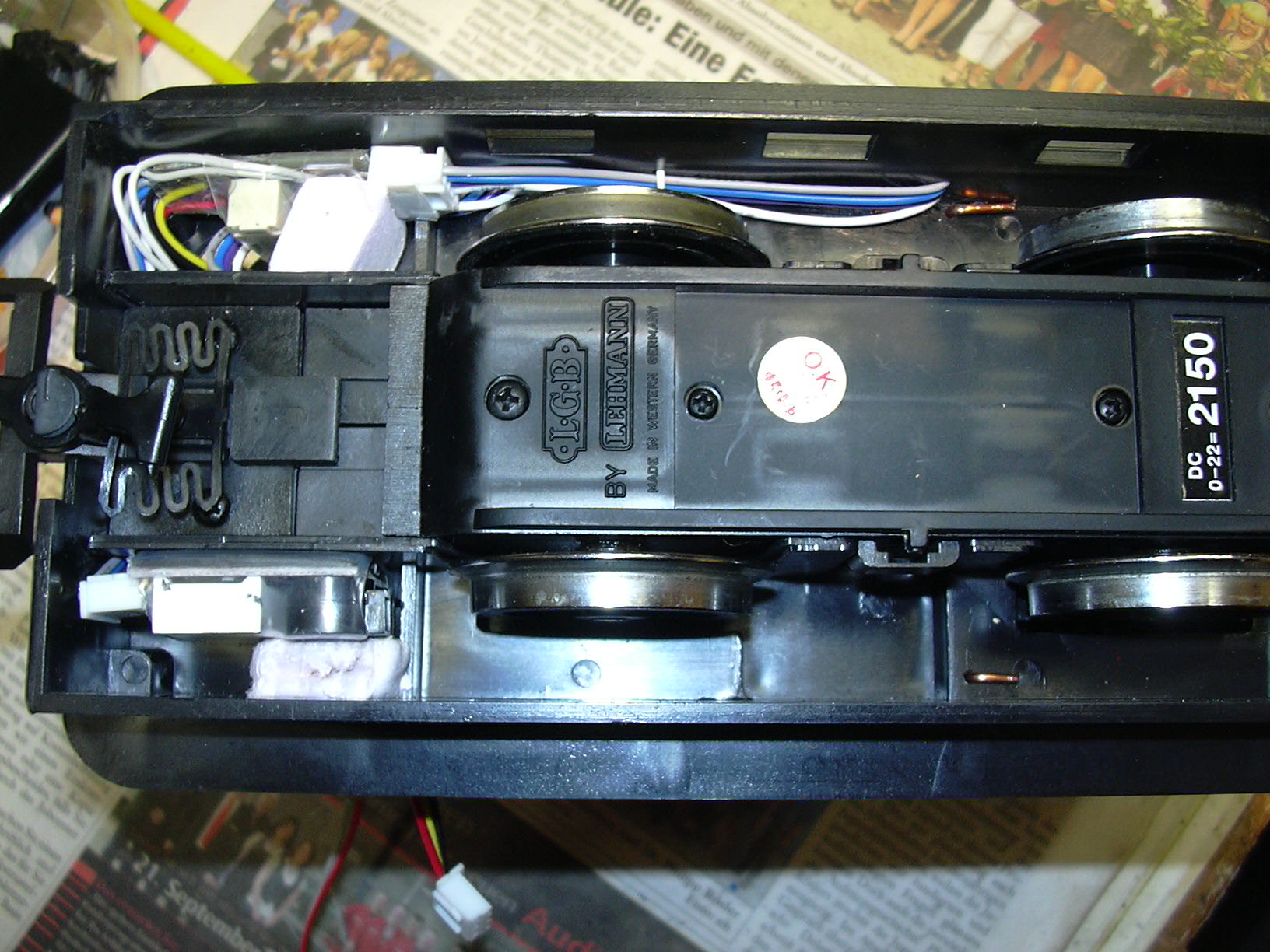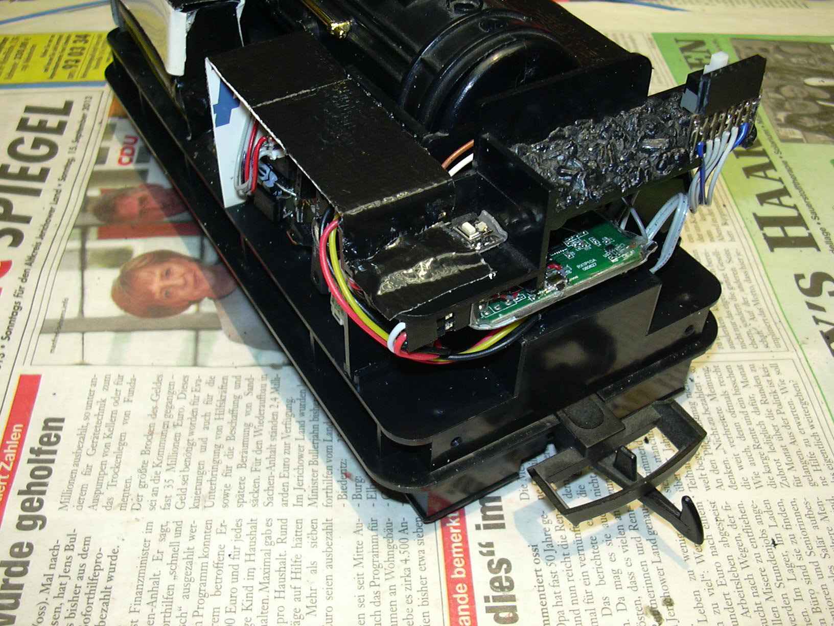 Die Zwischendecke mit Lautsprecher und zwei LEDs (links) ist mit doppelseitigem Klebeband eingeklebt. an der linken unteren Ecke der Zwischendecke führt das Kabel zur Frontbeleuchtung. Am rechten Rand ist der Steckverbinder zum Unterteil der Lok zu sehen.