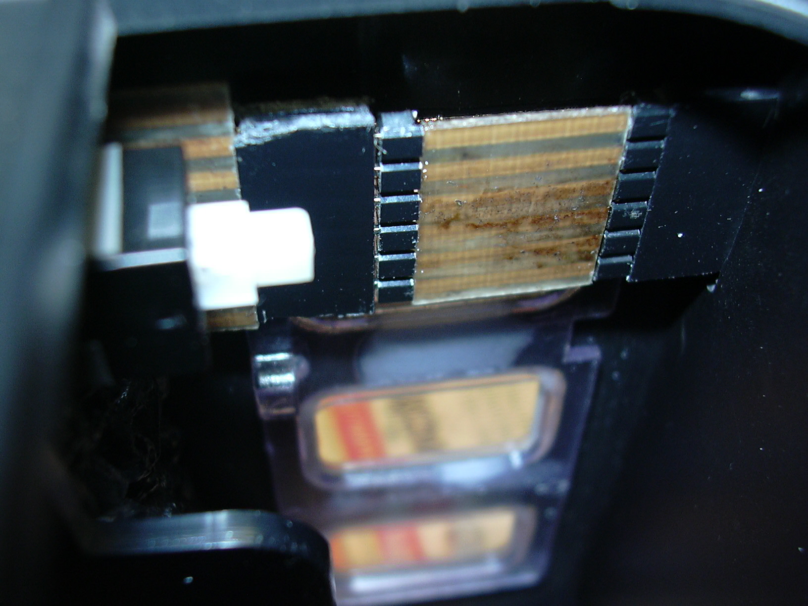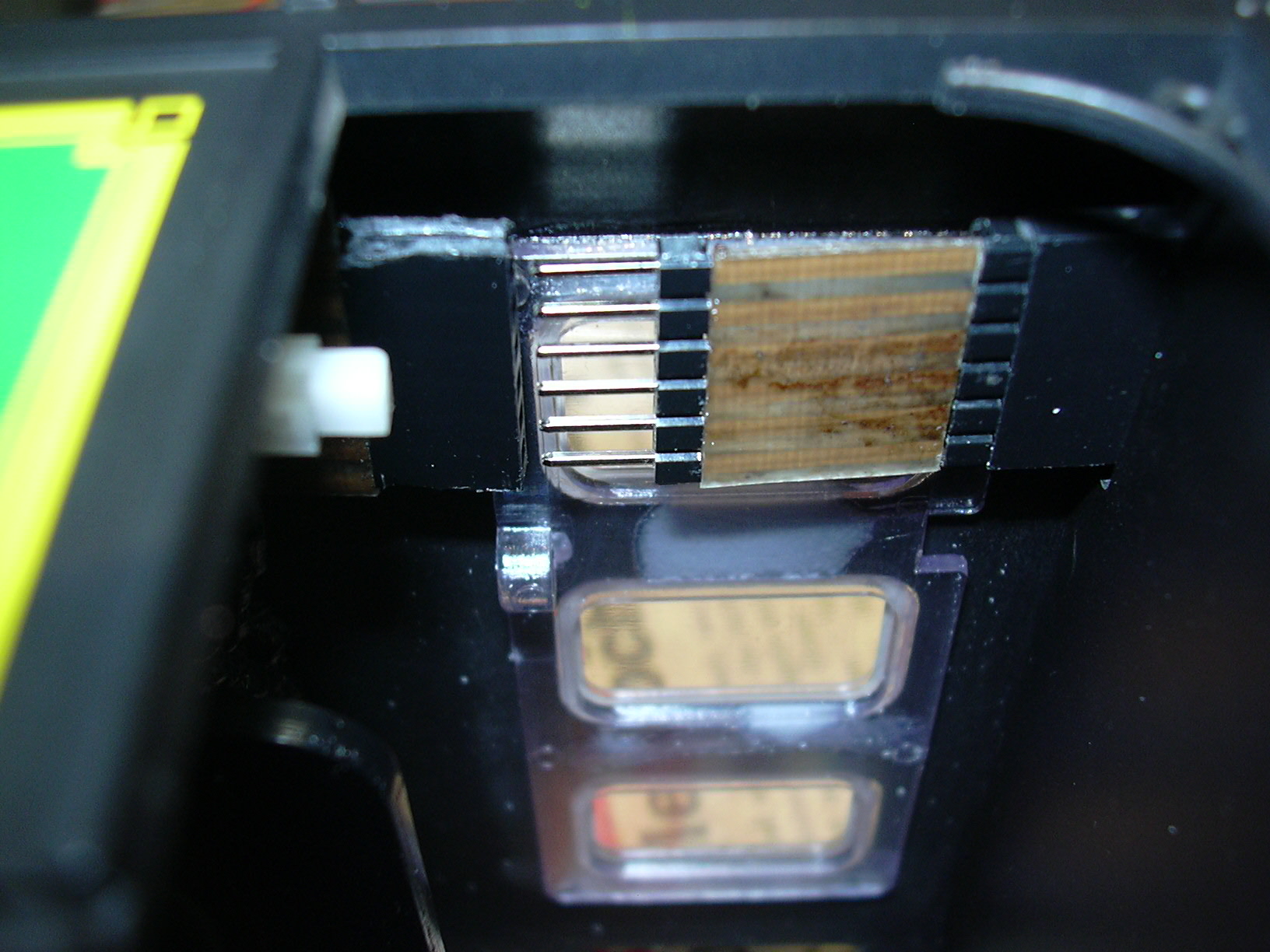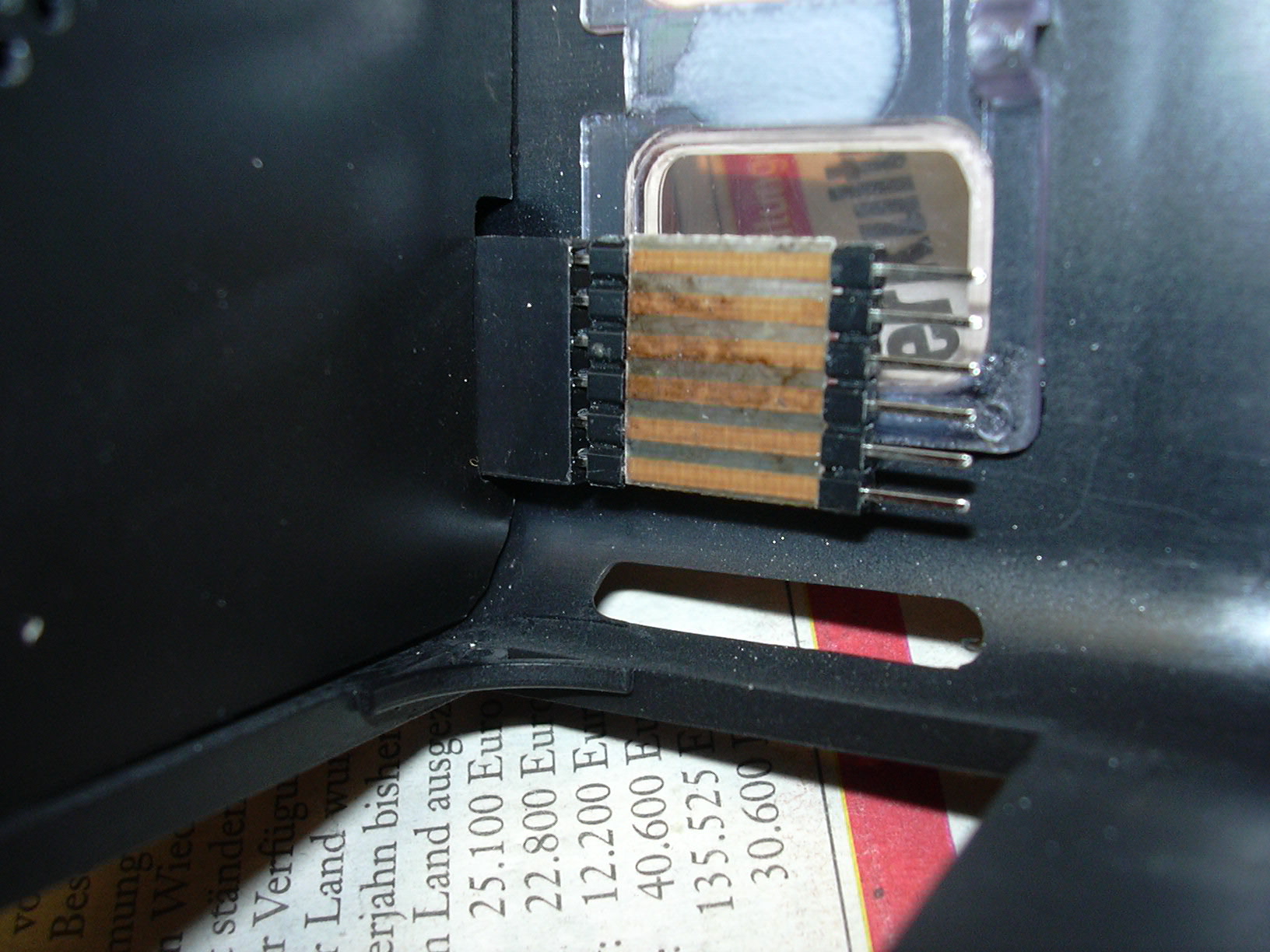 Die Zwischendecke mit Lautsprecher und zwei LEDs (links) ist mit doppelseitigem Klebeband eingeklebt. an der linken unteren Ecke der Zwischendecke führt das Kabel zur Frontbeleuchtung. Am rechten Rand ist der Steckverbinder zum Unterteil der Lok zu sehen.