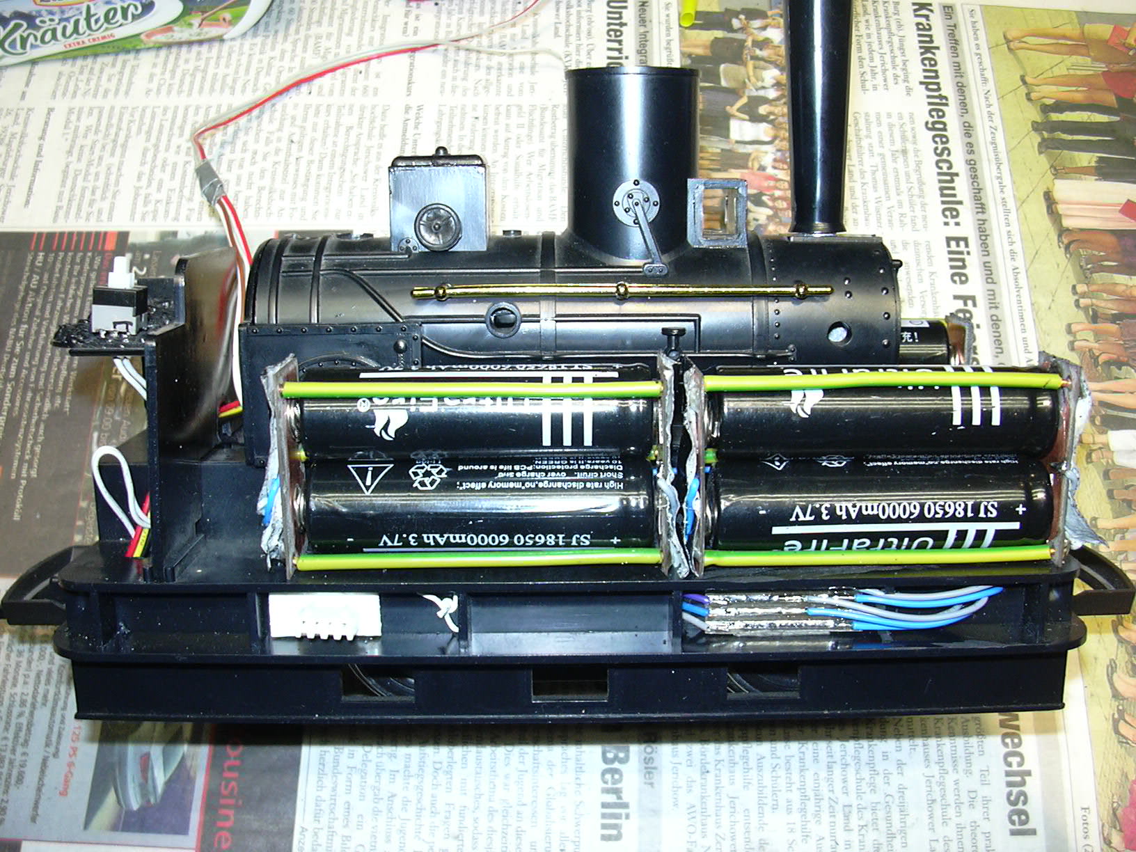 Diese ist ein Stück Platine mit 4 Streifen, auf das von rechts kommend die Einzelzellen angeschlossen sind und nach links das (bei allen meinen Dreizeller-Lokumbauten übliche) vieradrige Batteriekabel herausführt. Links im Rahmen sieht man (noch ganz in weiß) die Ladebuchse, deren Leitungen zur Relaisplatine führen. Oberhalb des Rahmens sind 3 Eigenbau-Batteriekammern für je 2 parallel geschaltete Li-Ionen-Zellen der Bauform 18650 montiert, 2 davon auf dieser Seite, die dritte auf der anderen Seite.