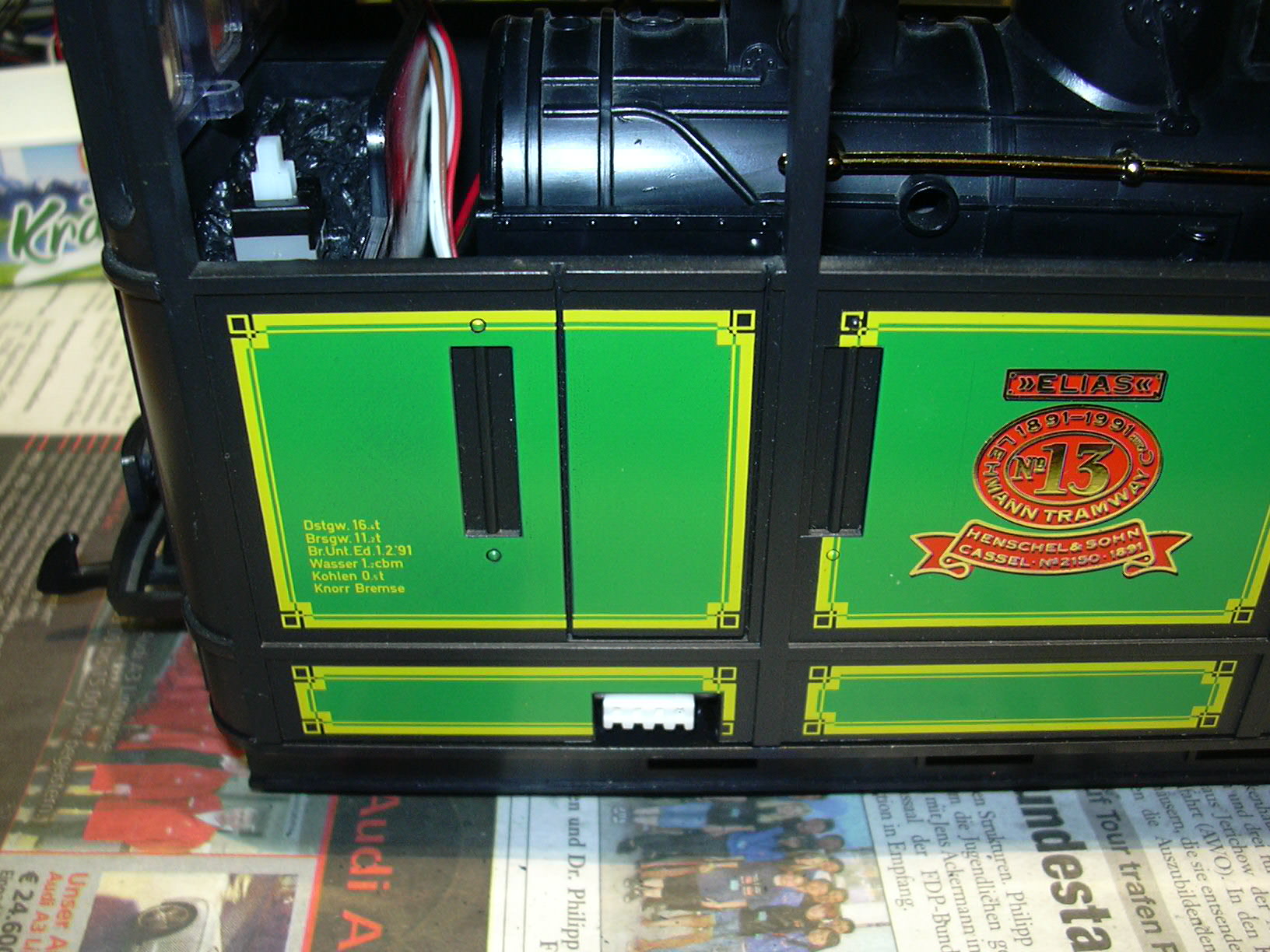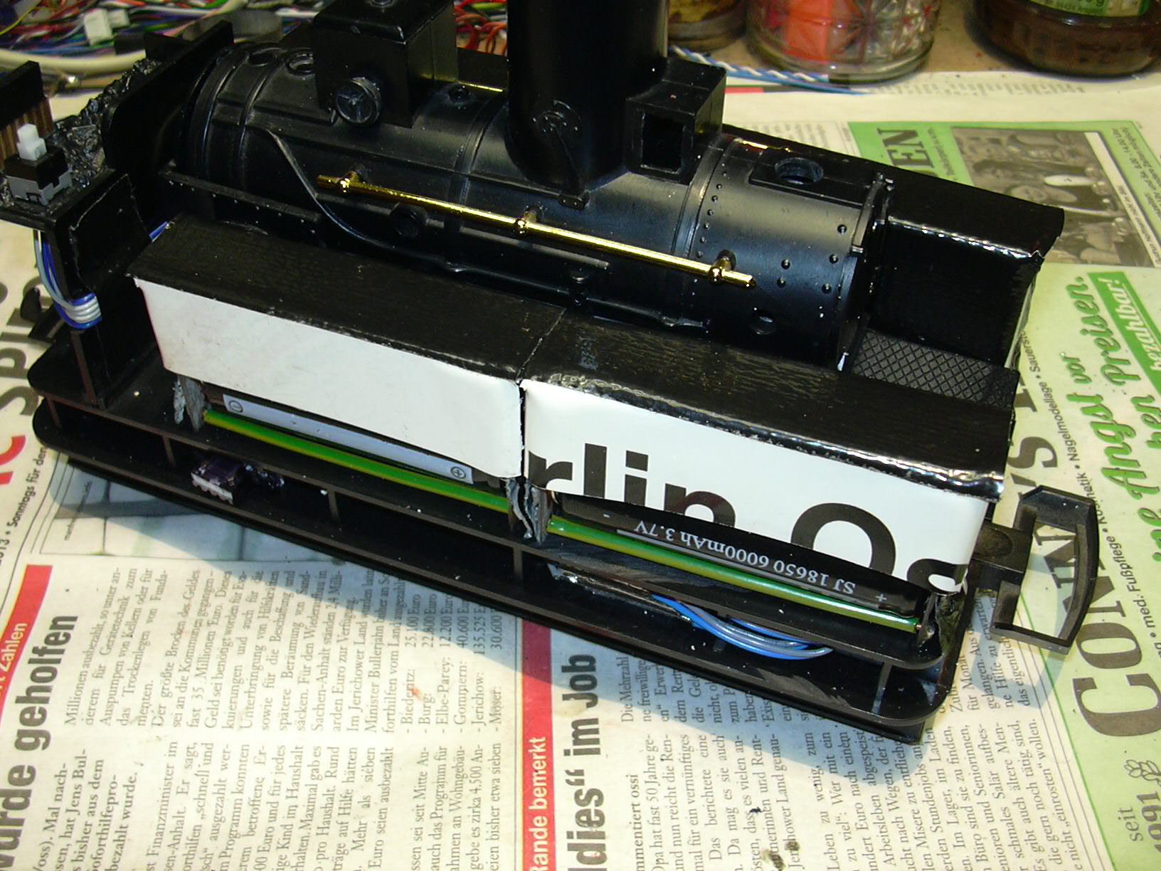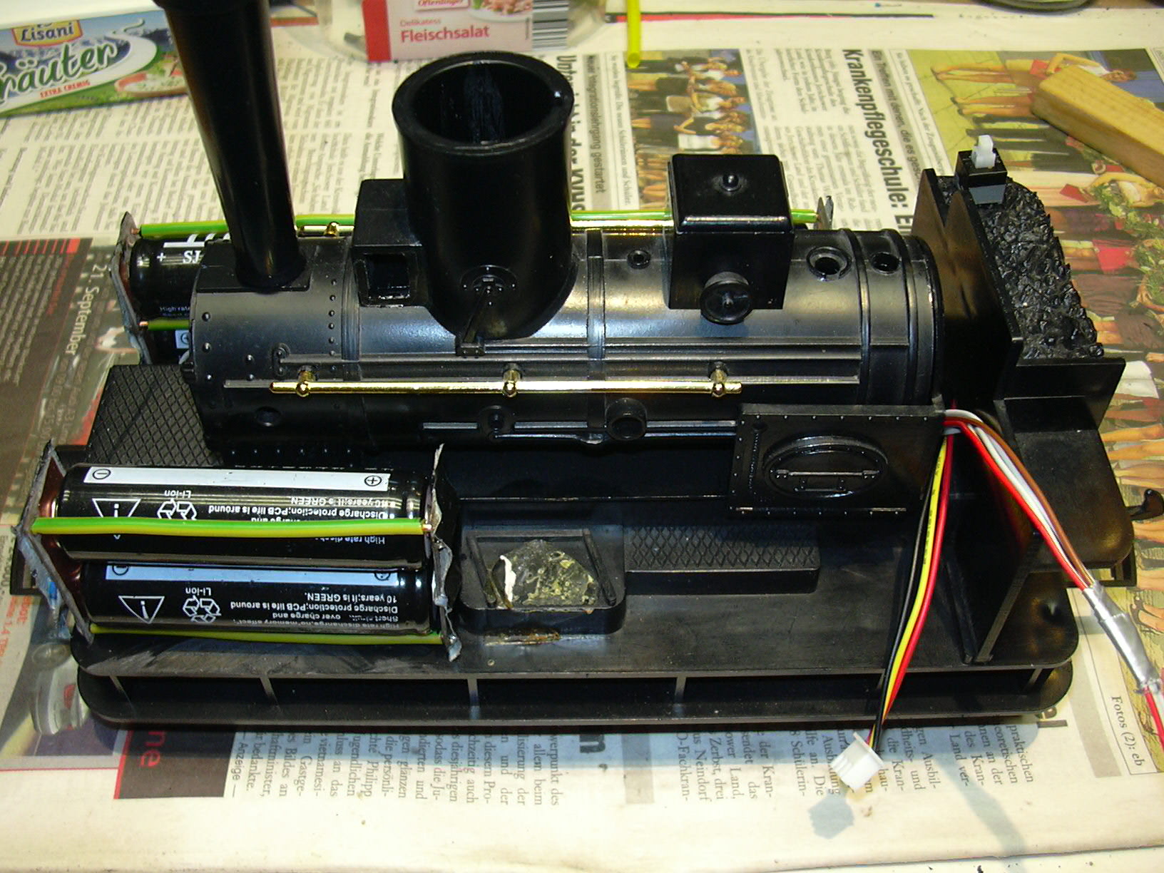 Rechts oben auf dem Kohlenkasten ist der Batterieschalter zu sehen. Zwischen Kessel und Kohlenkasten werden die Anschlüsse von Stromversorgung (linkes dreiadriges Kabel mit 0 V, 4 V und 12 V), Motor (rechts, braun und weiß) und Hall-Sensor (rechts, Flachband rot-grau-grau) nach oben geführt.