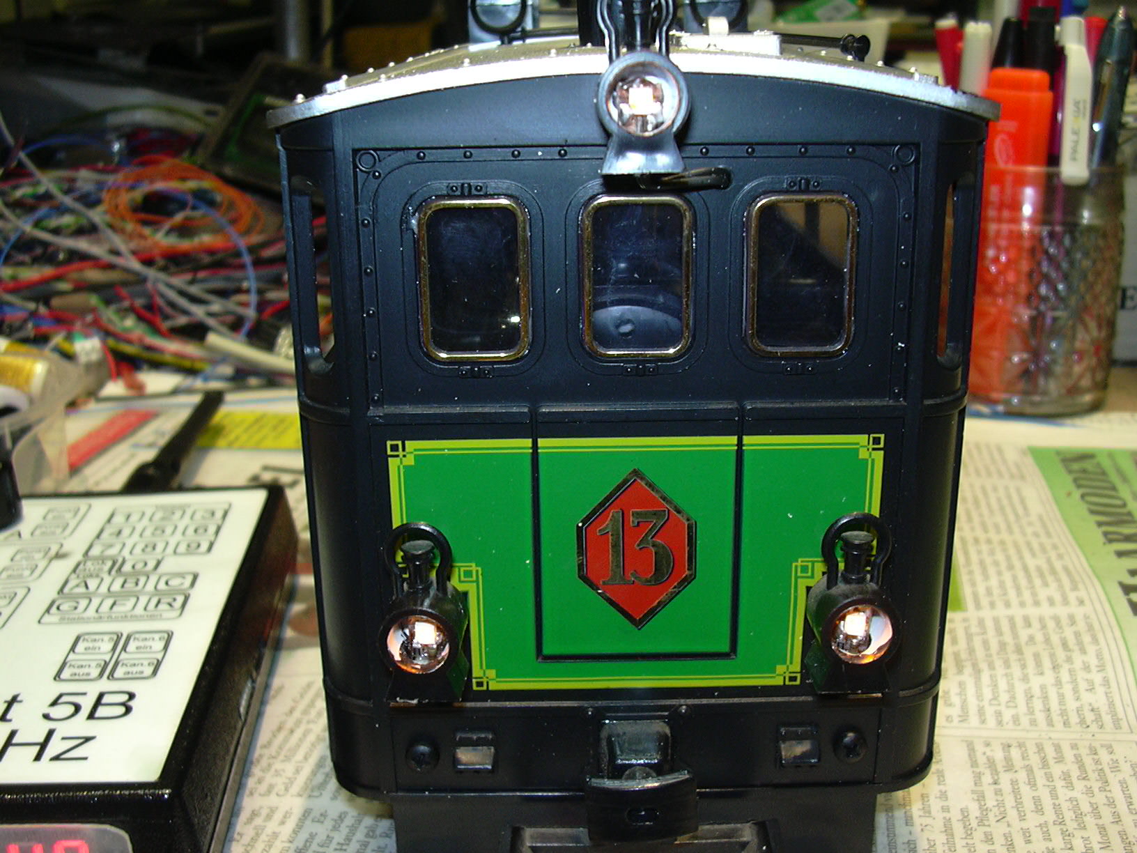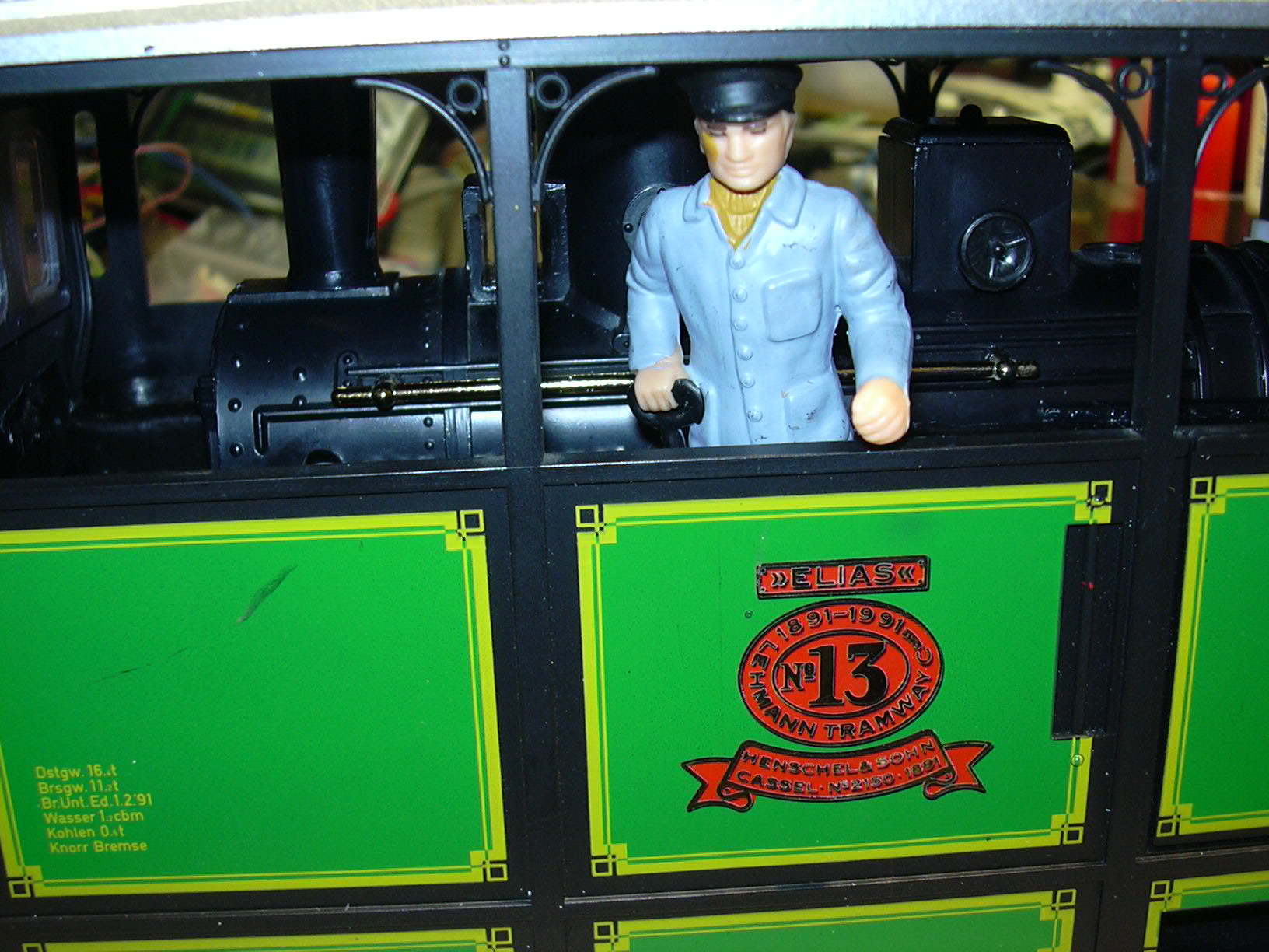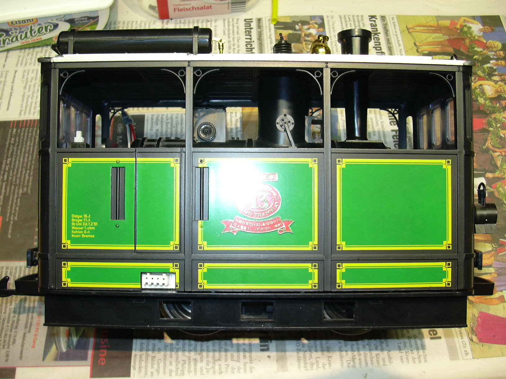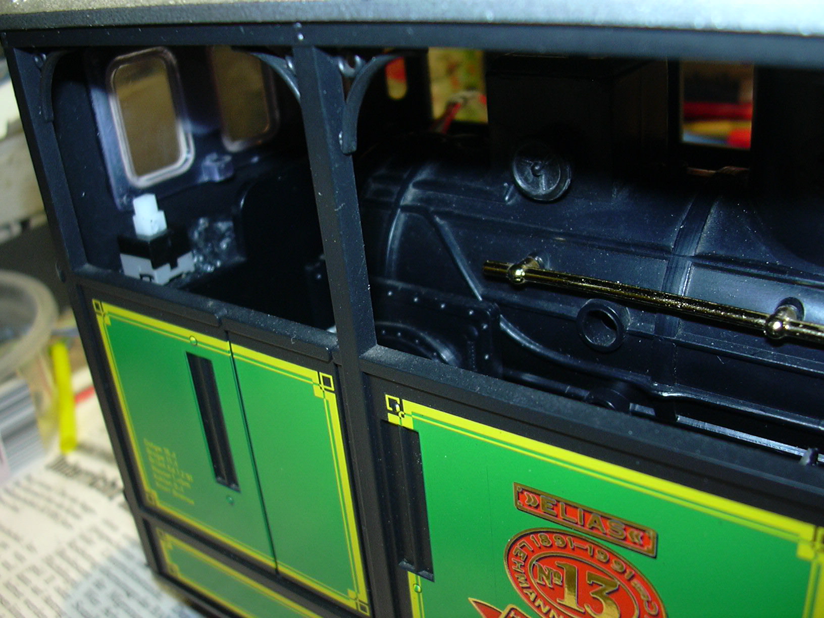 Rechts oben auf dem Kohlenkasten ist der Batterieschalter zu sehen. Zwischen Kessel und Kohlenkasten werden die Anschlüsse von Stromversorgung (linkes dreiadriges Kabel mit 0 V, 4 V und 12 V), Motor (rechts, braun und weiß) und Hall-Sensor (rechts, Flachband rot-grau-grau) nach oben geführt.