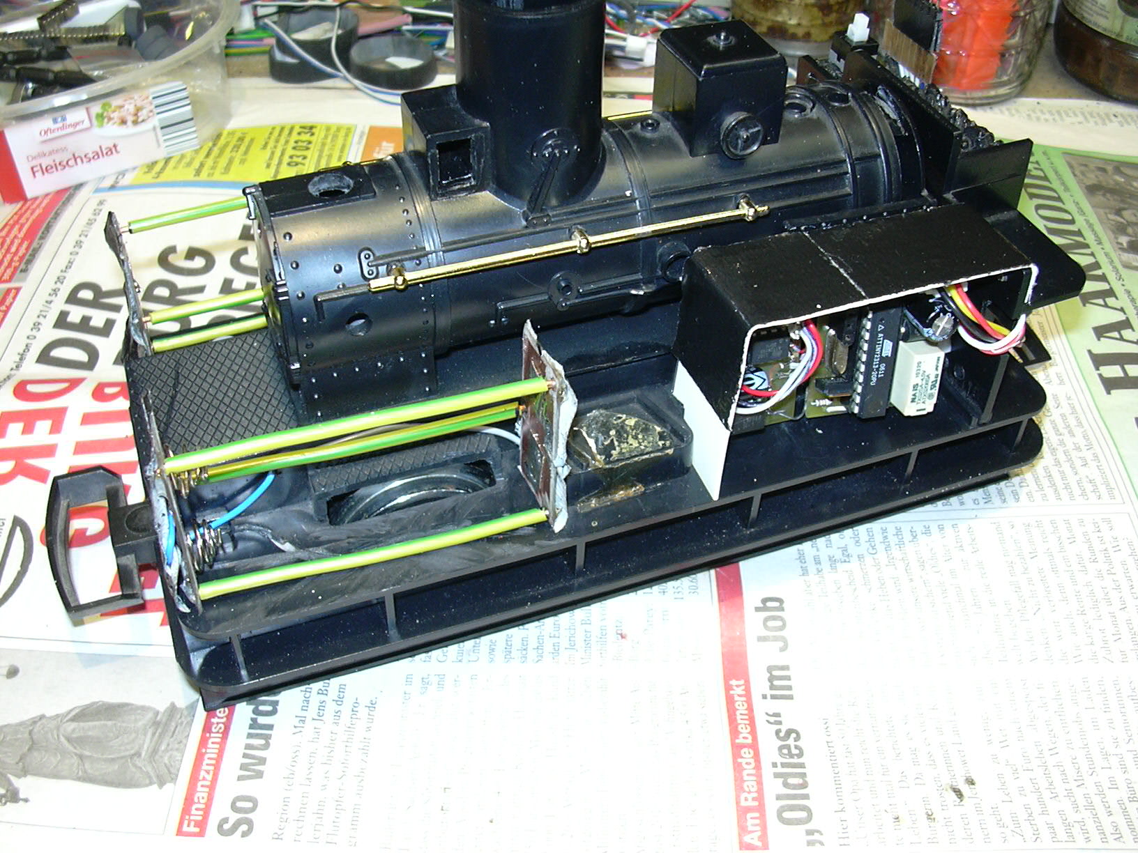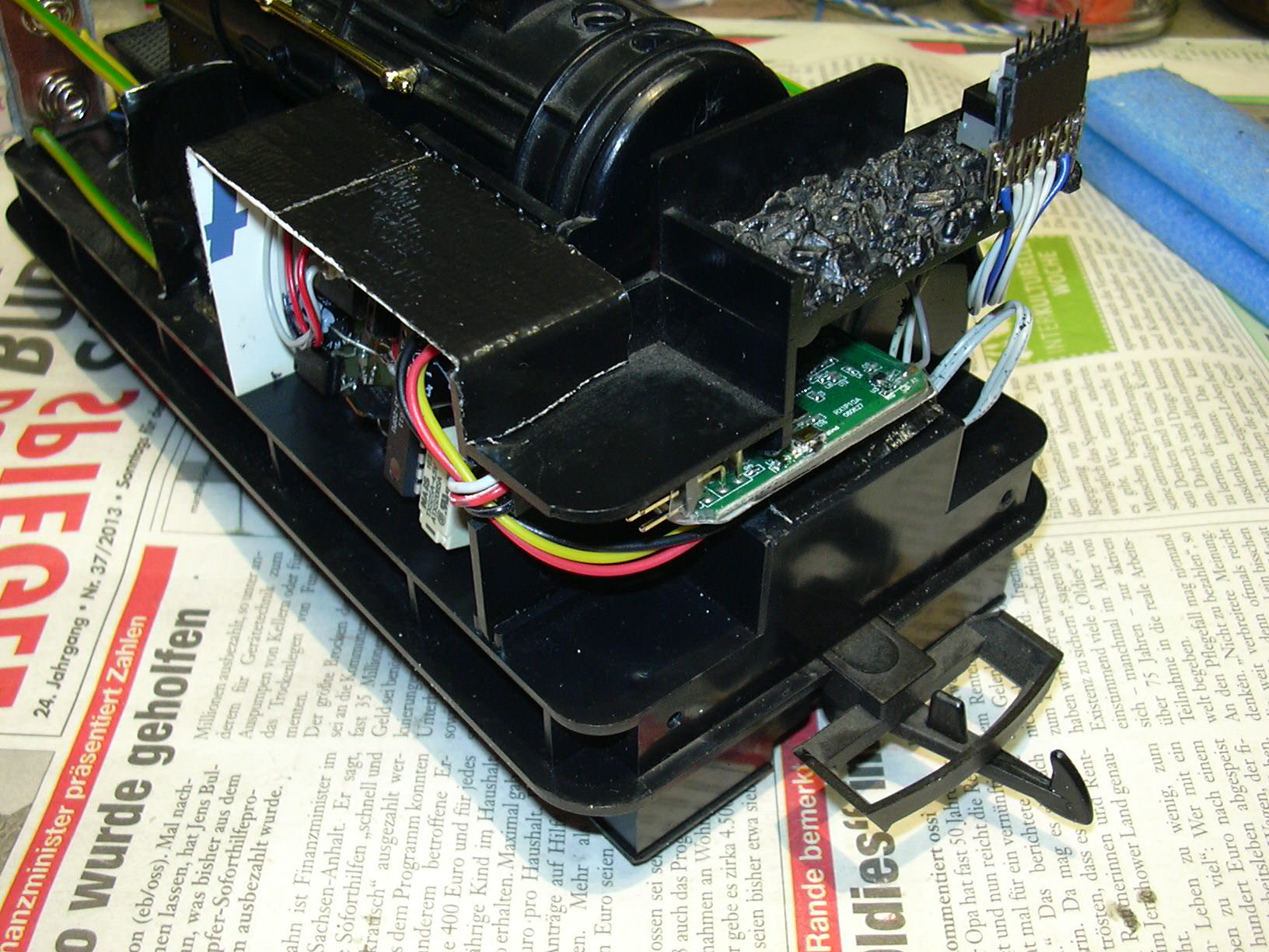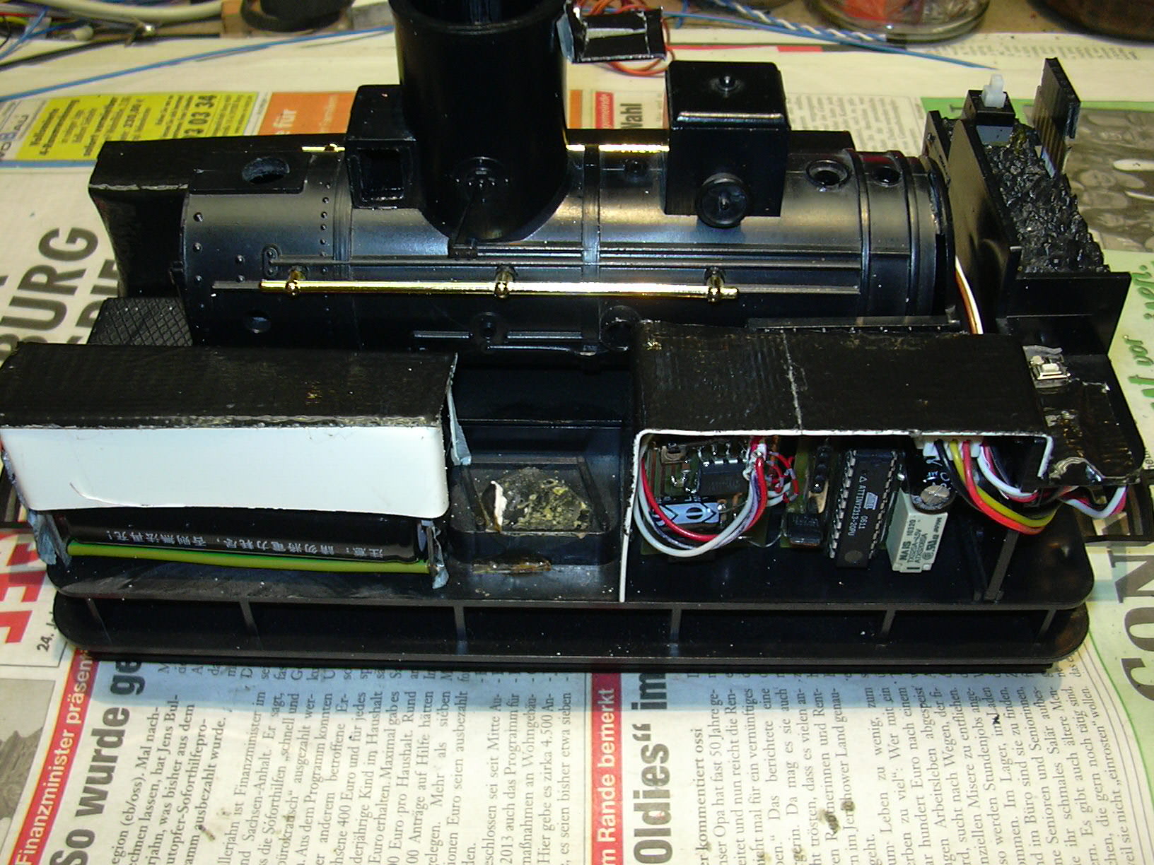 ...der unter dem Kohlenkasten Platz gefunden hat. Rechts oben auf der Kohle ist der Steckverbinder zum Wagenkasten, über den Frontbeleuchtung, Innenbeleuchtung und Lautsprecher angeschlossen werden. Rechts unten ist die Kabeldurchführung von der Relaisplatine (schwarz/rot/gelb zum lokfahrtregler und grau/grau zum Schalter).