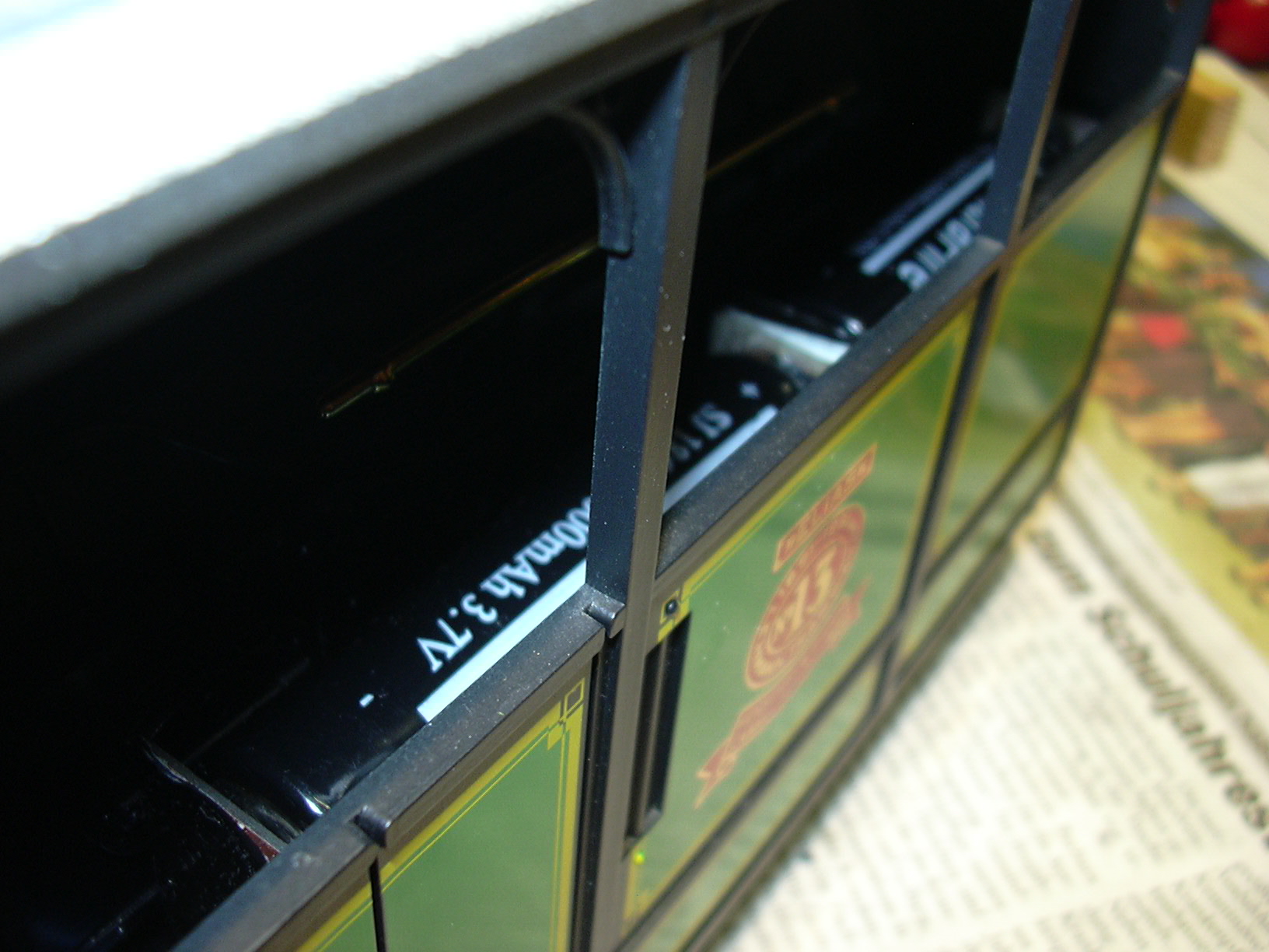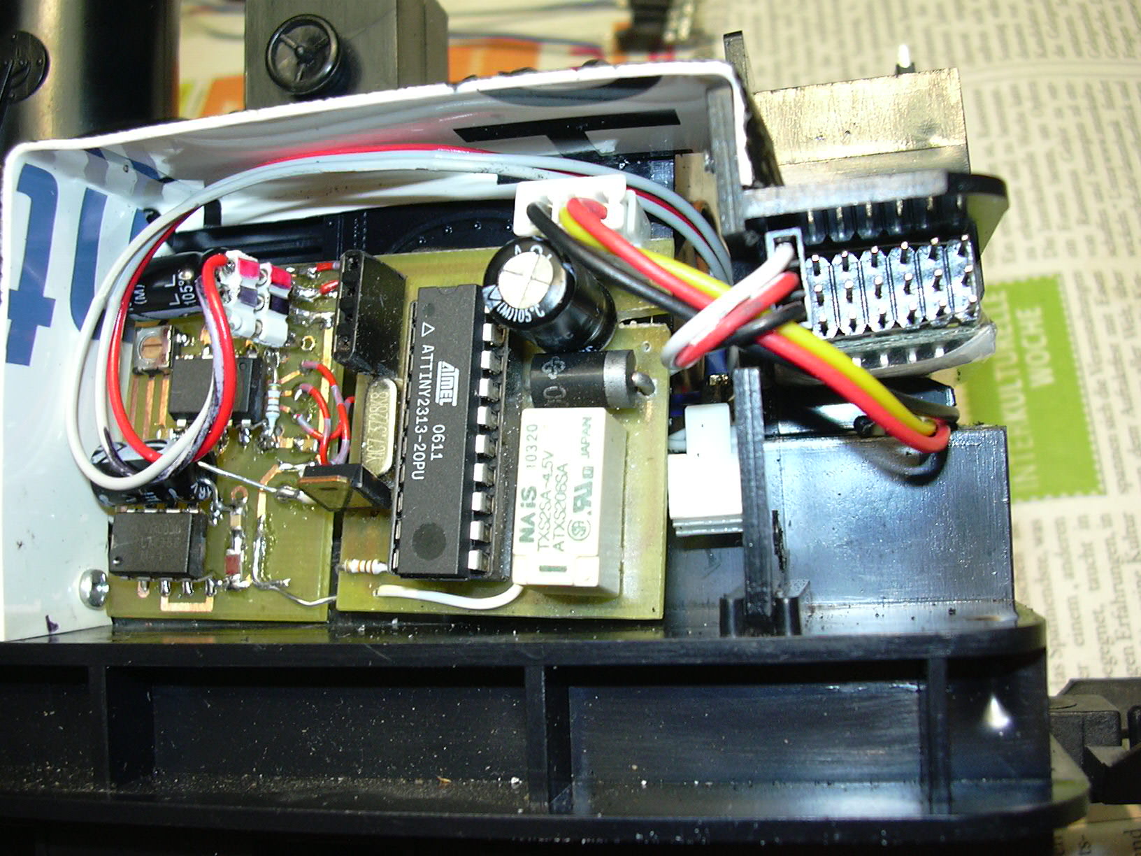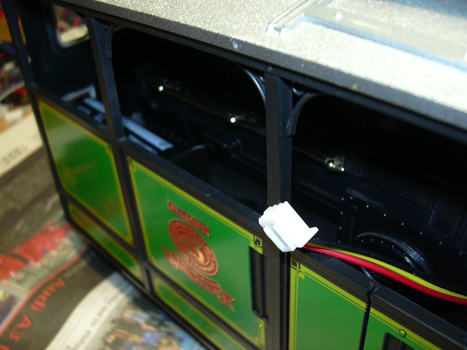 ...der unter dem Kohlenkasten Platz gefunden hat. Rechts oben auf der Kohle ist der Steckverbinder zum Wagenkasten, über den Frontbeleuchtung, Innenbeleuchtung und Lautsprecher angeschlossen werden. Rechts unten ist die Kabeldurchführung von der Relaisplatine (schwarz/rot/gelb zum lokfahrtregler und grau/grau zum Schalter).