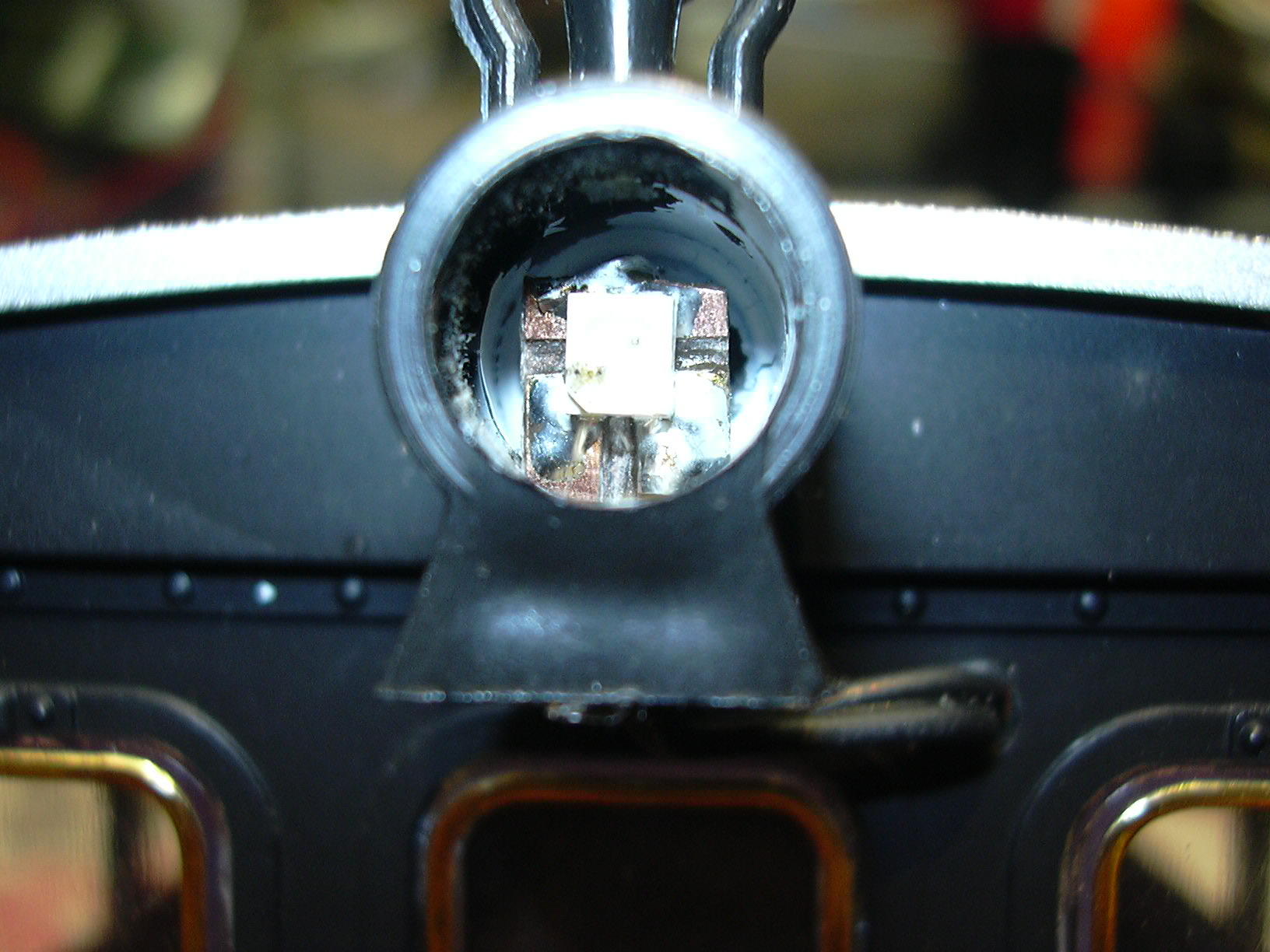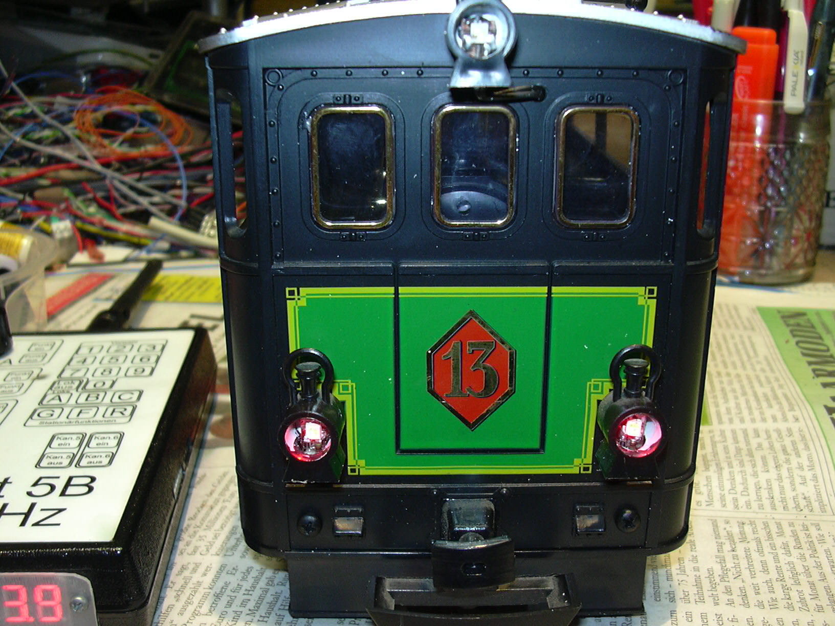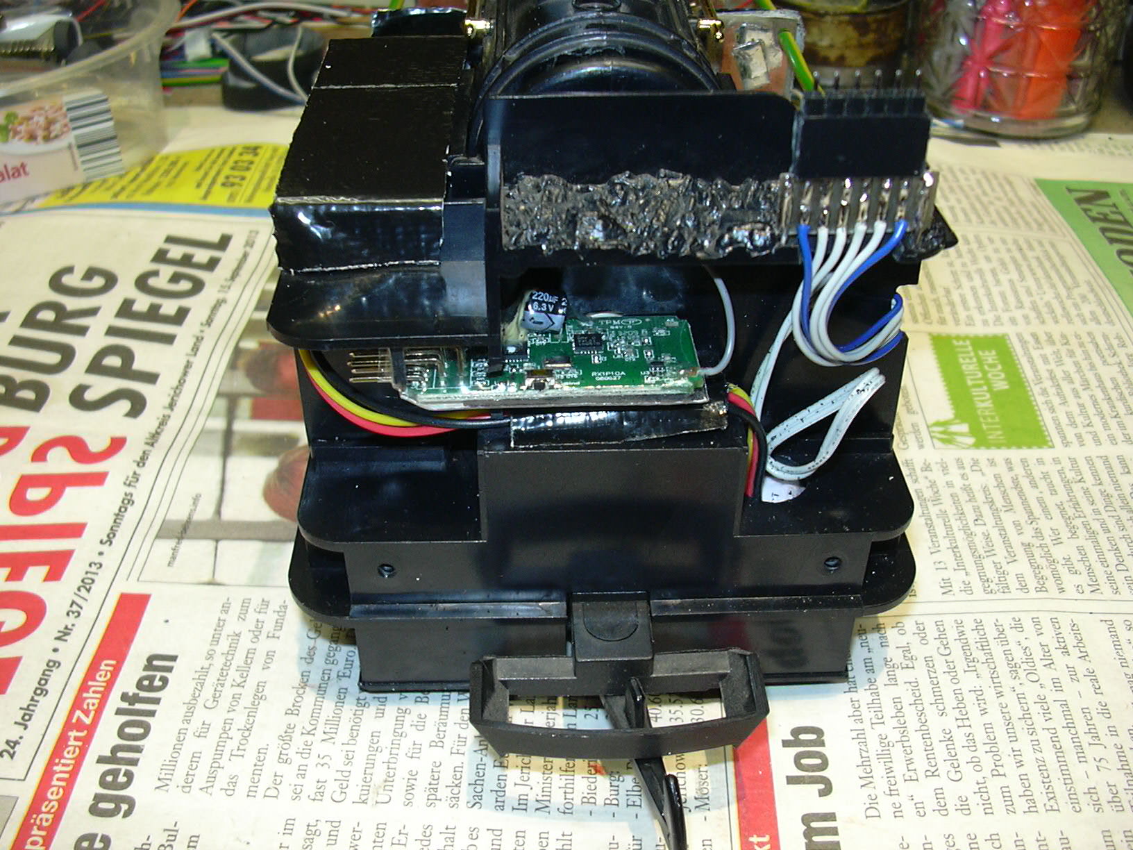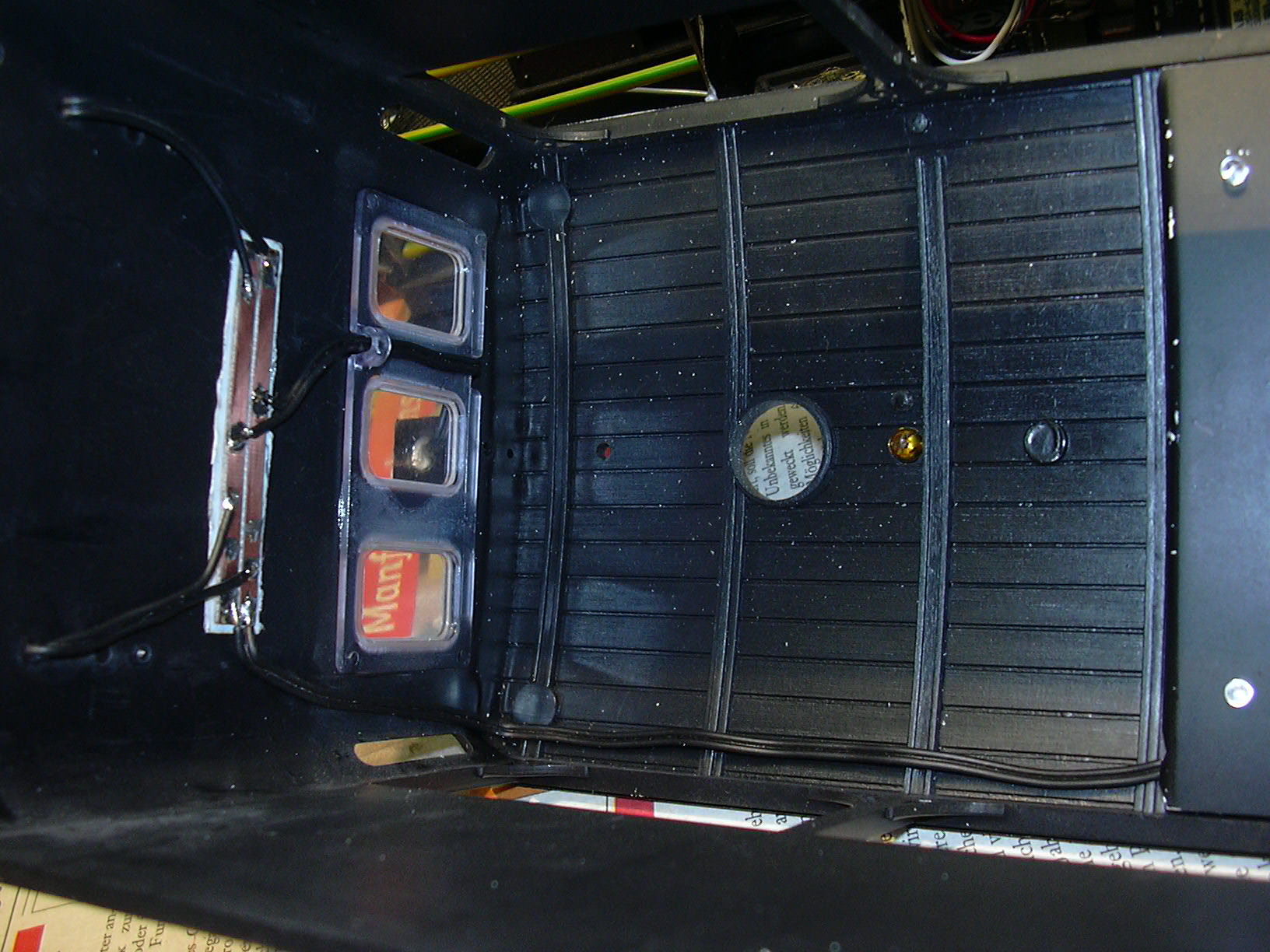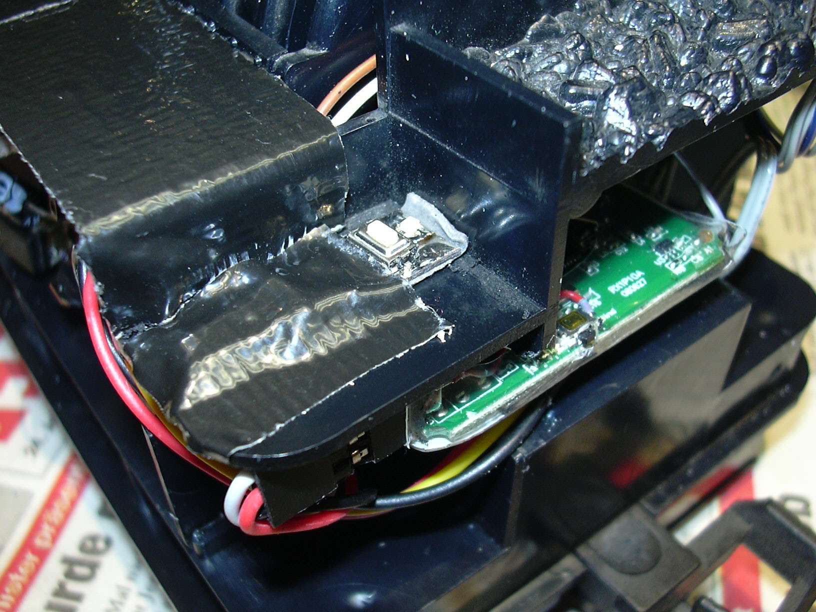 ...ist eine Platine zum Anschluss der 3 Frontlampen angeklebt. Diese wurde später mit schwarzem Textilklebeband abgedeckt.