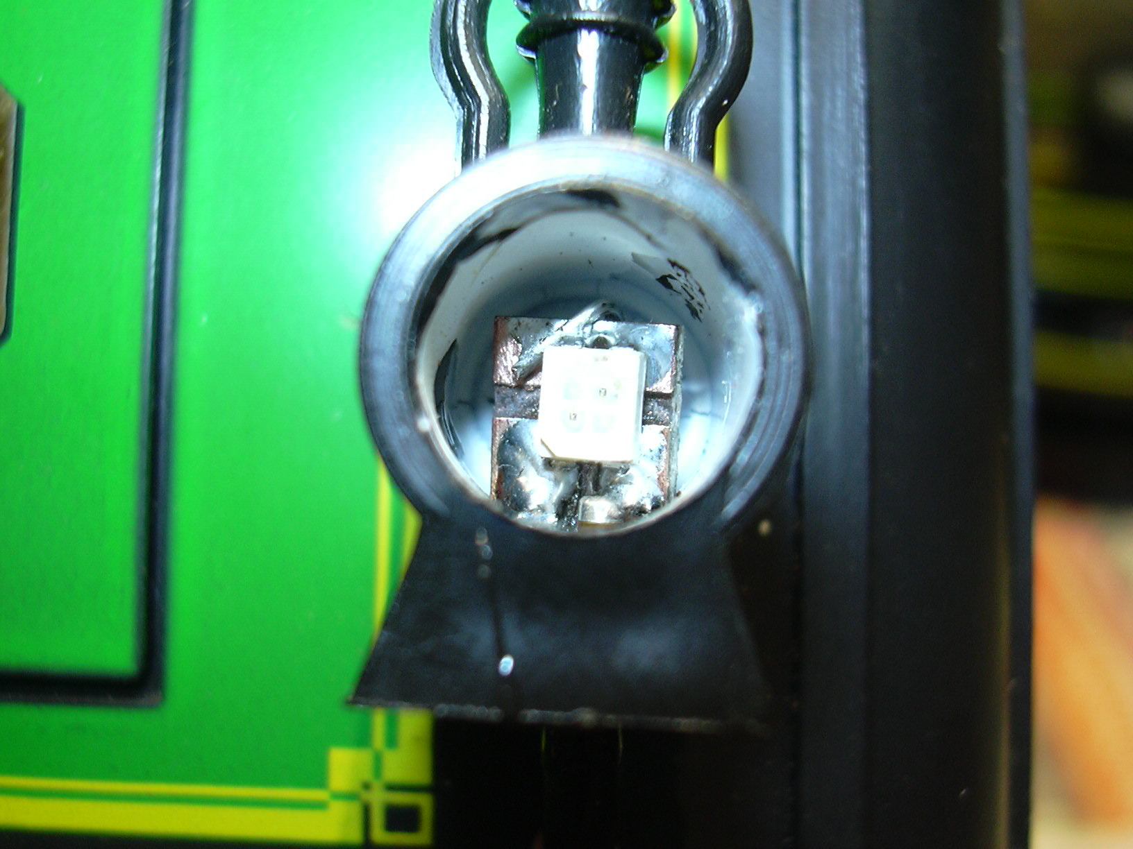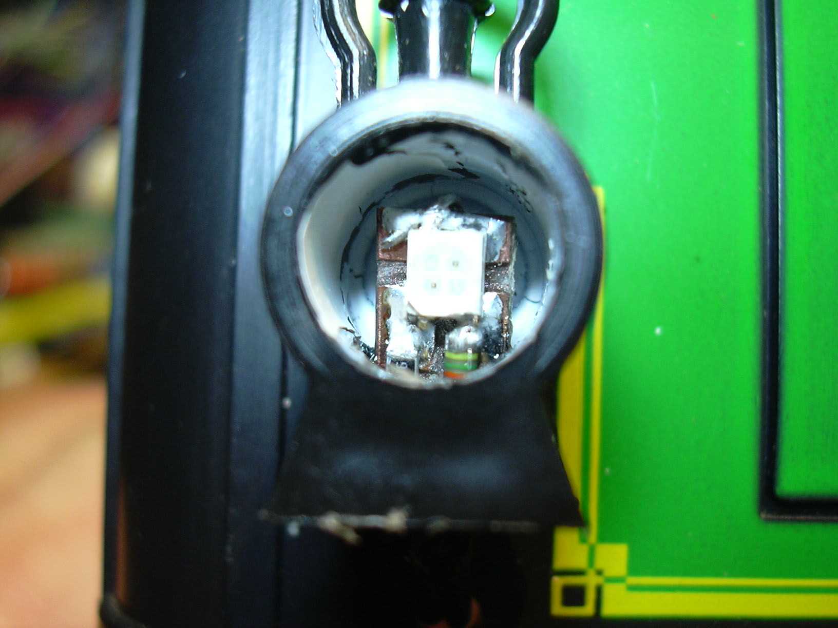 ...sind zweifarbige SMD-LEDs (rot/gelb) eingesetzt, die auf kleine Platinenstücke gelötet wurden, die auch die SMD-Vorwiderstände tragen. Beide LEDs sind dabei antiparallel geschaltet, was den Farbwechsel durch Umpolen ermöglicht.