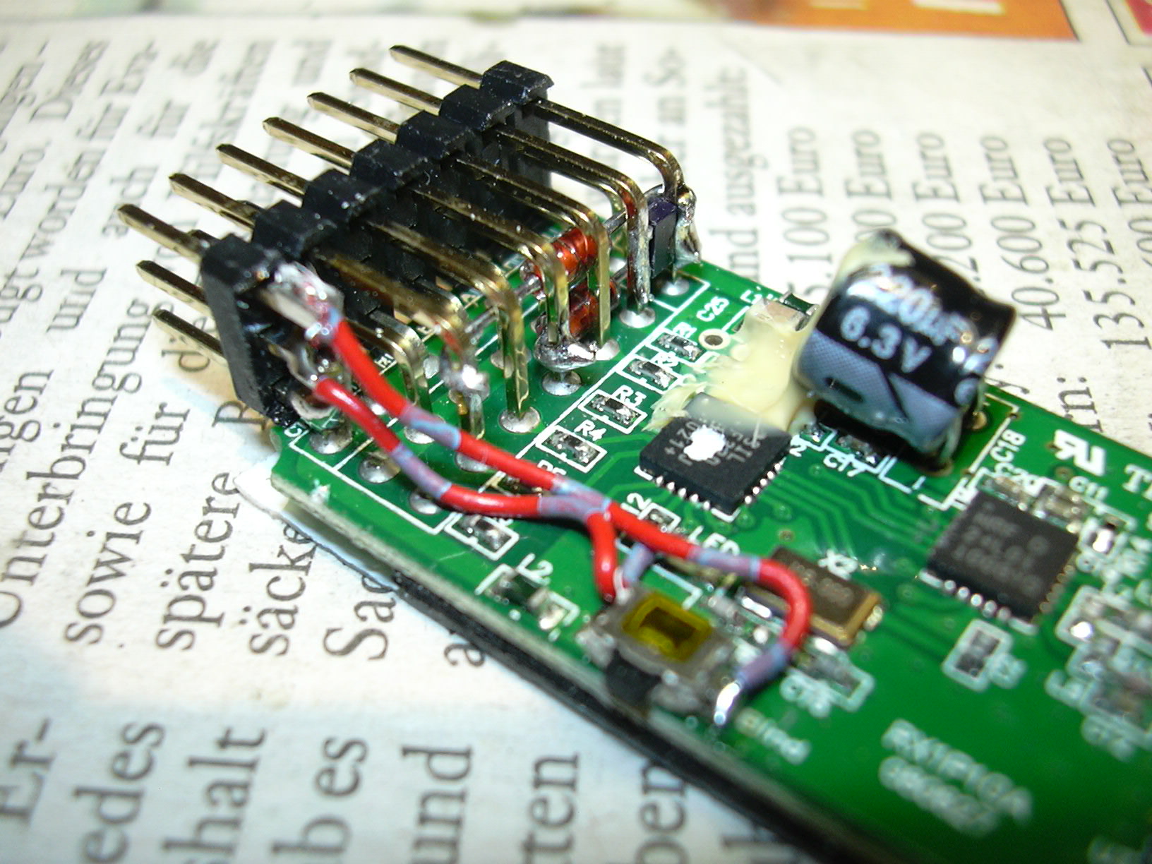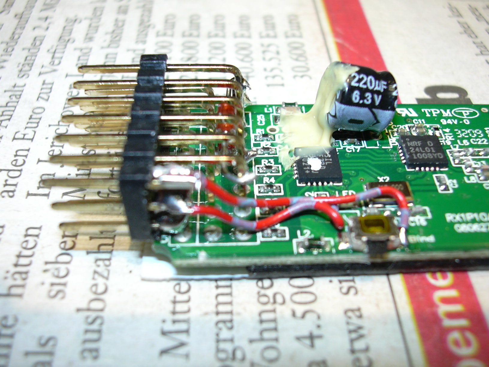 Dazu wurden vom nicht verwendeten Anschluss des Kanal 6 die beiden Pins für Plus und Impuls von der Platine getrennt (herausgekniffen) und mittels eines Stück Platine (3 Lötpads) mechanisch mit dem Massepin verbunden. Diese nun freien Pins wurden mittels Draht (rot/blaugrau) mit Binde-LED und Binde-Taster verbunden.