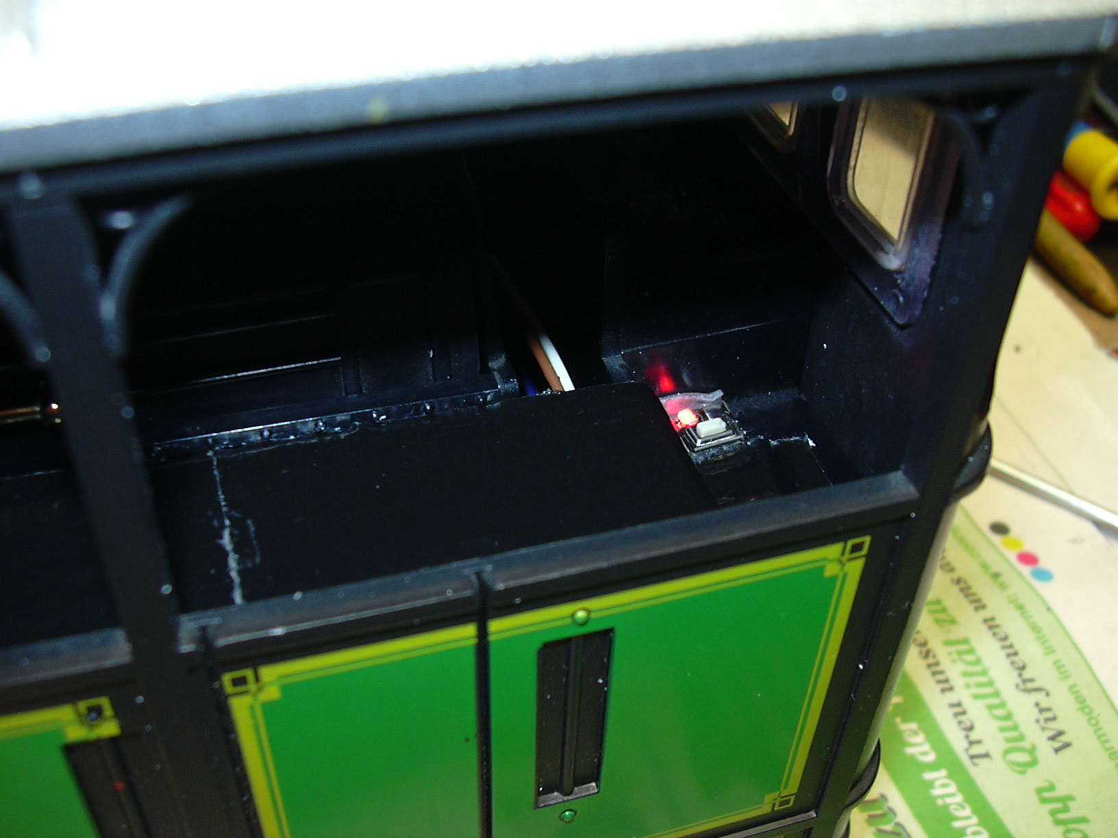 Die externe Taster/LED-Kombination wurde oben neben dem Kohlenkasten aufgeklebt. Dort ist sie gut erreichbar, aber trotzdem nicht übermäßig auffällig.
